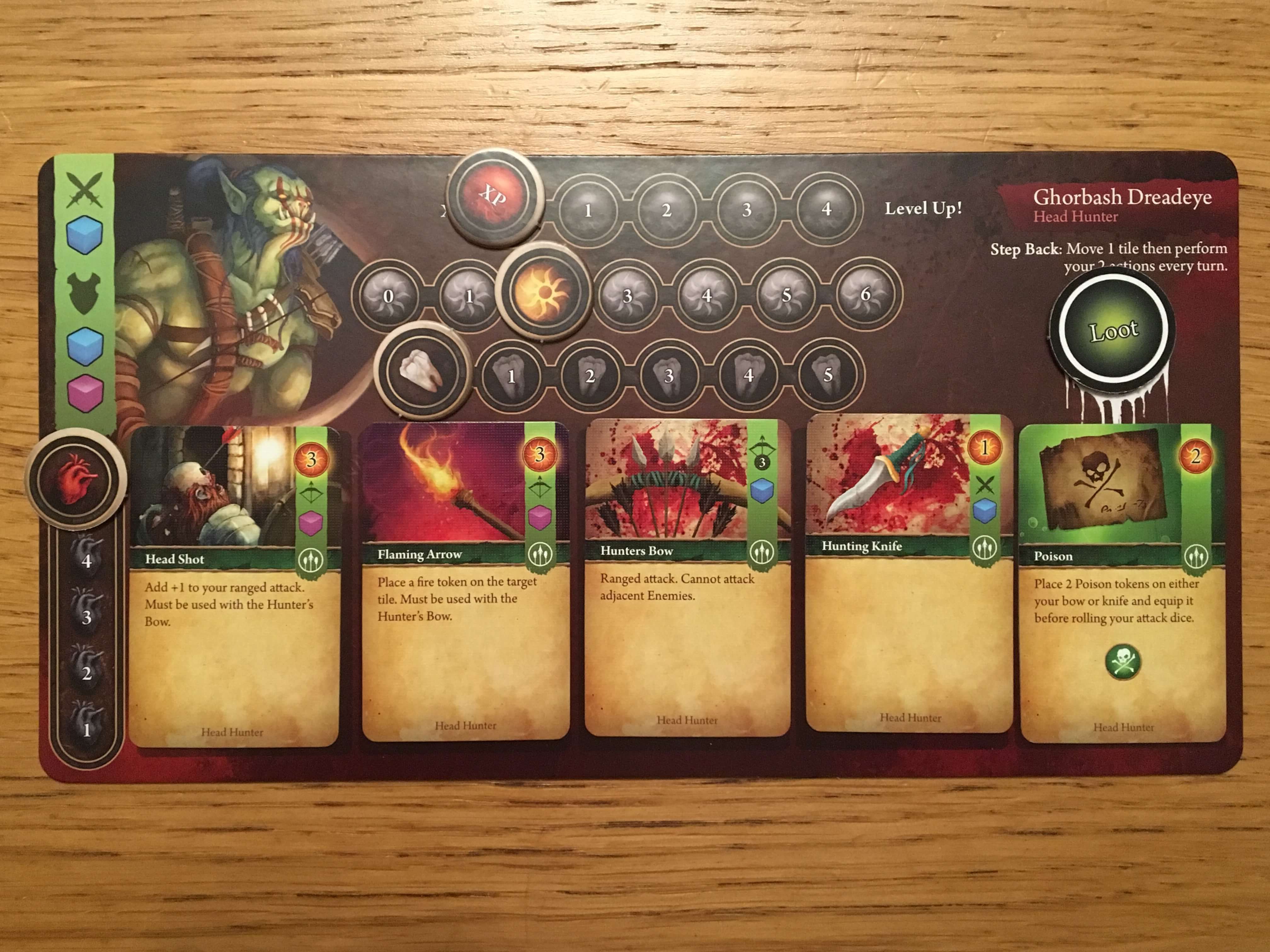 Probably the most attractive single component in the game, the main player boards feature well-laid-out places for character skills chosen, teef, health, energy and experience counters. The skill cards that slot onto these are smaller than normal and feature clear, straightforward artwork that offers easy access to key information. Each orc has a special ability shown in the top right and this (along with everything else you’ll need to know) is clearly visible on the player boards.