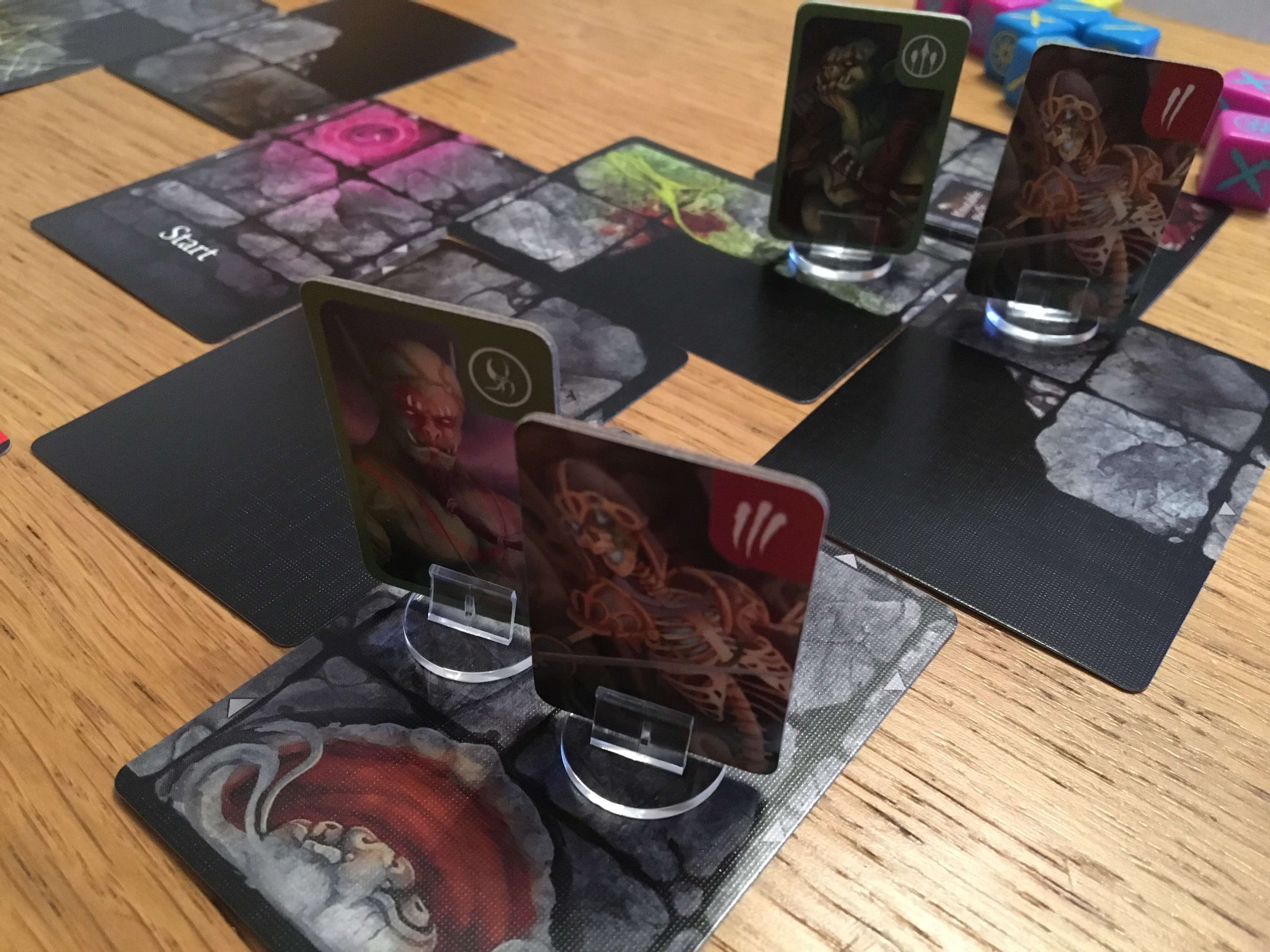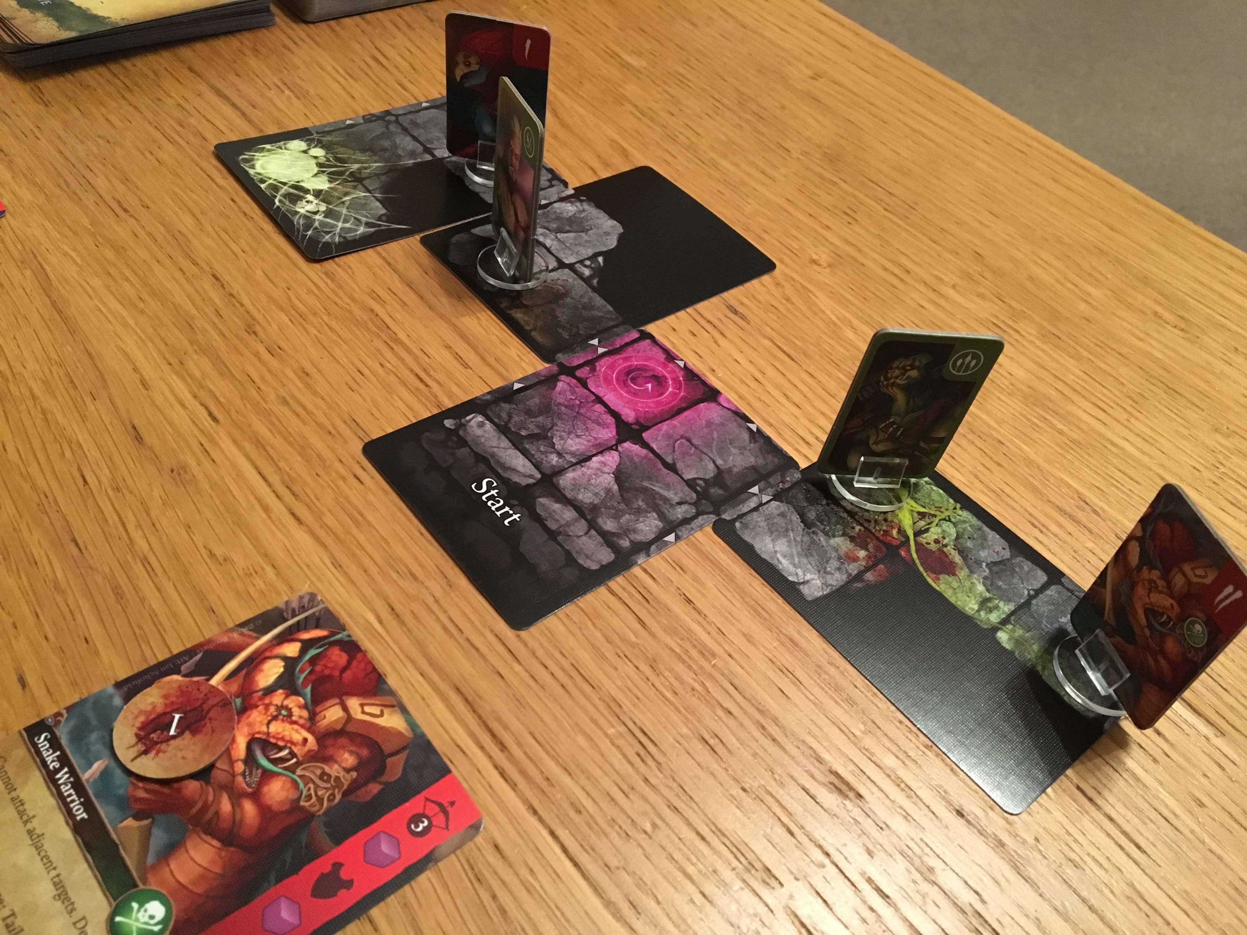 The delve cards that make up the board are each drawn from a deck and placed face up on the table. Made of a proportion of black space and a number of spaces representing the corridors and rooms around the dungeon, some cards have special locations like healing fountains or spawn points, whilst others can spawn boss locations comprising multiple tiles. Enemies, on the other hand, spawn from the Seek Glory deck and each one uses a system of symbols to indicate which standee it matches.