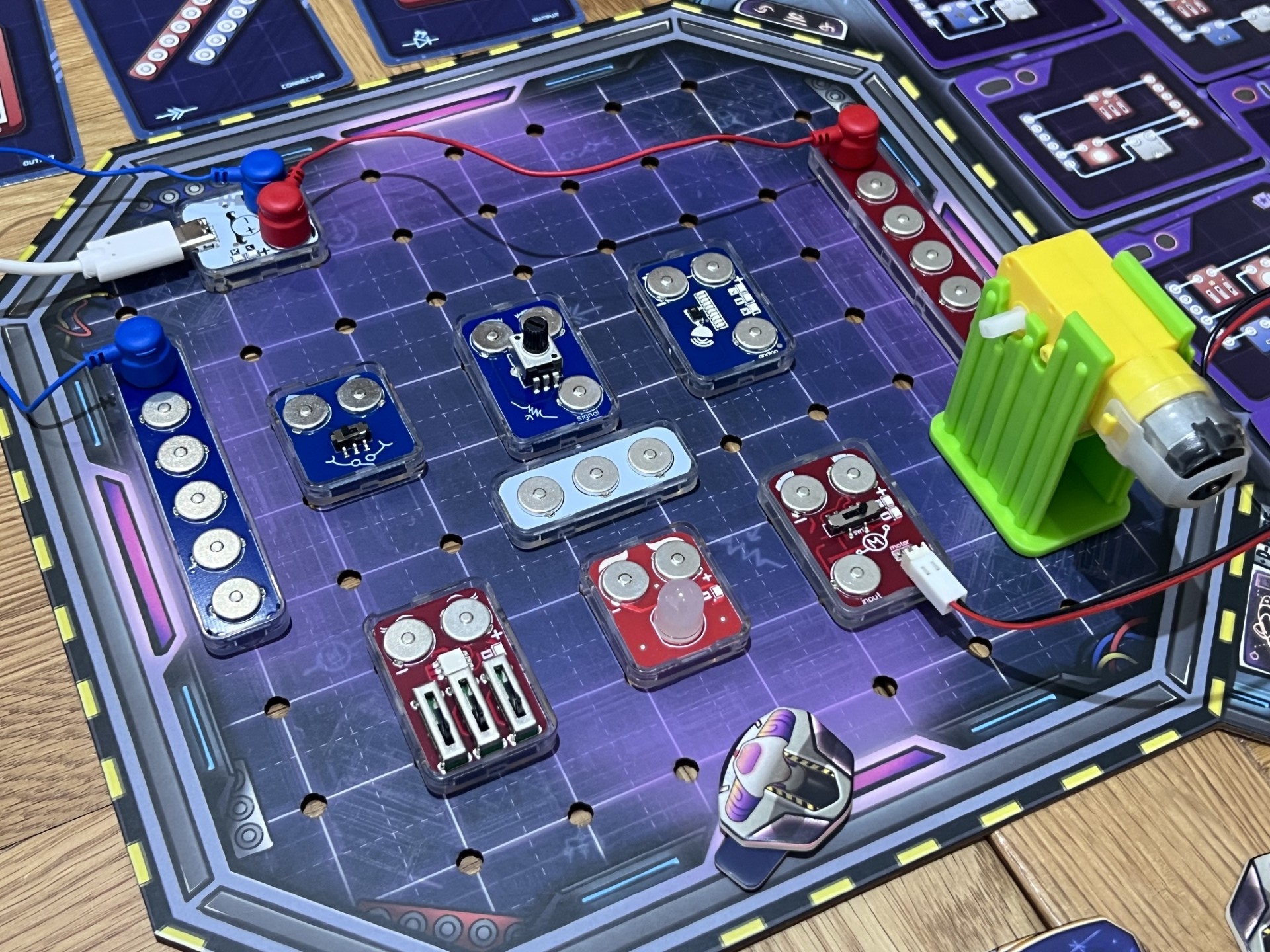 That hook alone sets it apart from almost anything else in the tabletop space, with perhaps Forbidden Sky being the only exception I can think of. What makes Reactor Rescue particularly interesting is how it tries to merge a competitive race game (where players must complete circuits to repair their space ship) with a hands-on STEM toolkit that uses Labbox’s modular electronic blocks to turn each round into a miniature engineering challenge.