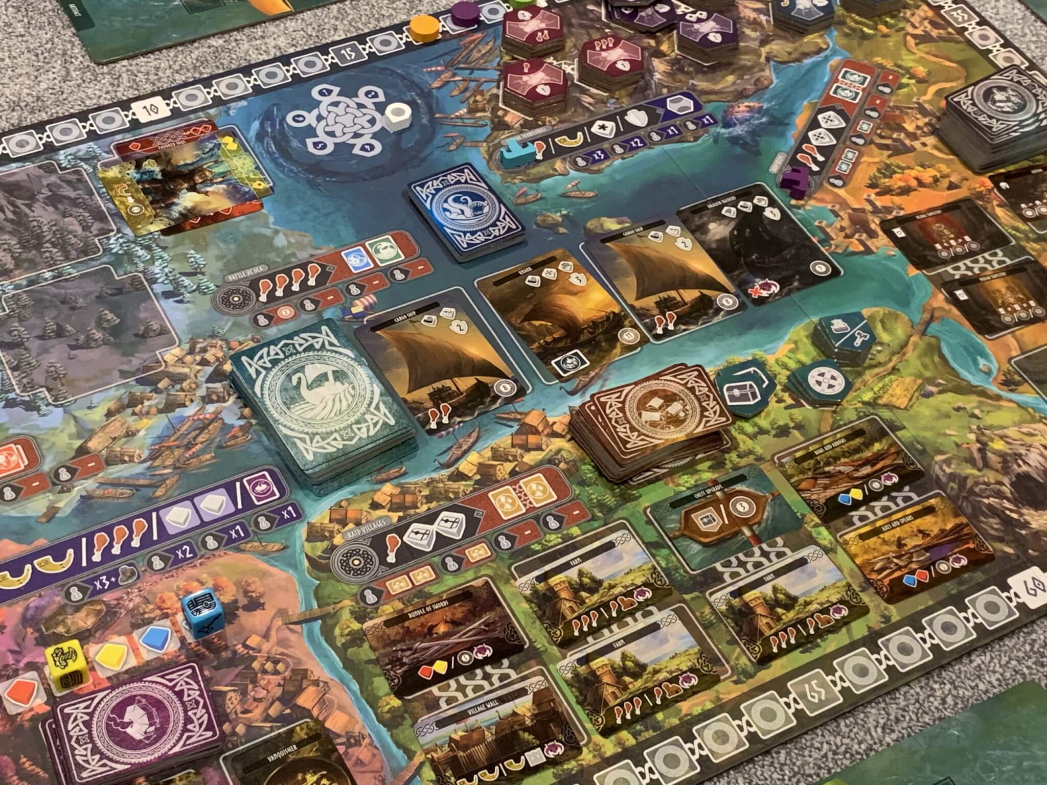 Now, because everyone gets bonuses (whether from the action space or resting) on every turn, Reavers of Midgard feels quite generous, to me. This is not the kind of stingy, super tight euro game where you’ll constantly be stroking your chin working out how to do things, it’s more a case of working out the optimal move from one turn to the next. What will score you the most glory? What will enable you to have a massive turn the next time round? Yes, you will sometimes need to knuckle down and take a lead action Trade With Villagers action, but once you have a few reavers generating bonuses for you, this becomes less and less necessary.