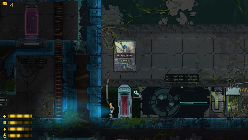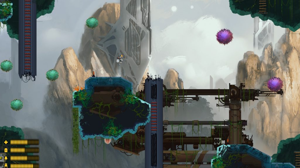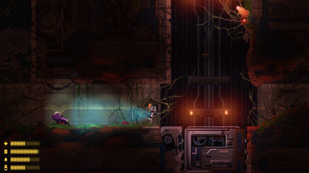 A save game that was loaded from near the end of the game showcased a map vaster than any I’ve seen in a metroidvania, and featured an inventory rammed with about 15 different throwable items -ranging from berries to frozen creatures. The character had gone through several upgrades, with a vastly improved jetpack than the one I had found cast aside in a lab side-room, and gameplay was increasingly reliant on the various creatures which populated the world. Rudolf deployed a few explosive frogs which knocked out a lethal creature that would have otherwise blocked my path, he then used the character’s extinguisher to break a Skrillion crystal, releasing the area from their stasis, but also accidentally unleashing a dozen of the creatures. Quickly throwing a few lizards into their path, however, gave him time to get away, and gave them easier targets to freeze. Returning a moment later and the Skrillions were gone, absorbed into the -now frozen- lizards.