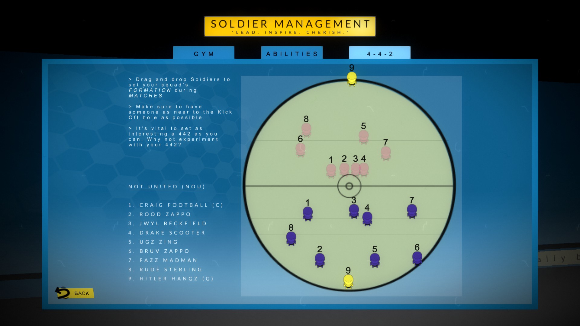 The game lacks any type of player role or area system, instead replacing ‘formations’ with a drag-drop ‘4-4-2’ screen in between matches. It’s not a bad system, and a good 4-4-2 can easily allow you to build a tactic or technique which works on a regular basis. Stack your players to the extreme sides of the pitch and you’ll have an easy time getting the ball forward if you get to the ball on each restart. Once the ball is out there, however, the absence of roles (No ‘Big Kickers’ who float near the frontlines, and no ‘Silver’ or ‘Bronze’ keepers who stay near the goldkeeper) and previously mentioned density of soldiers means that the game’s score system can at times be easily frustrated, this and the fact that even fully upgraded goldkeepers simply cannot deal with on-target shots. It’s handy then that the scoring of goals is made out to be something somewhat minor in the grand scheme of things.