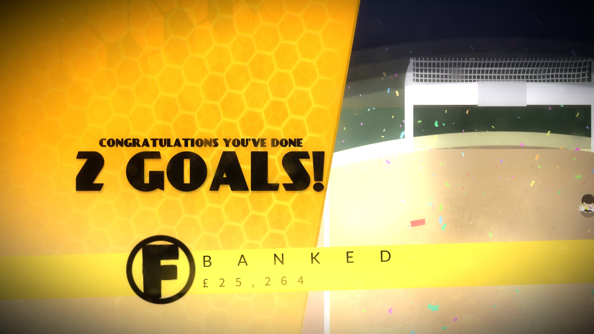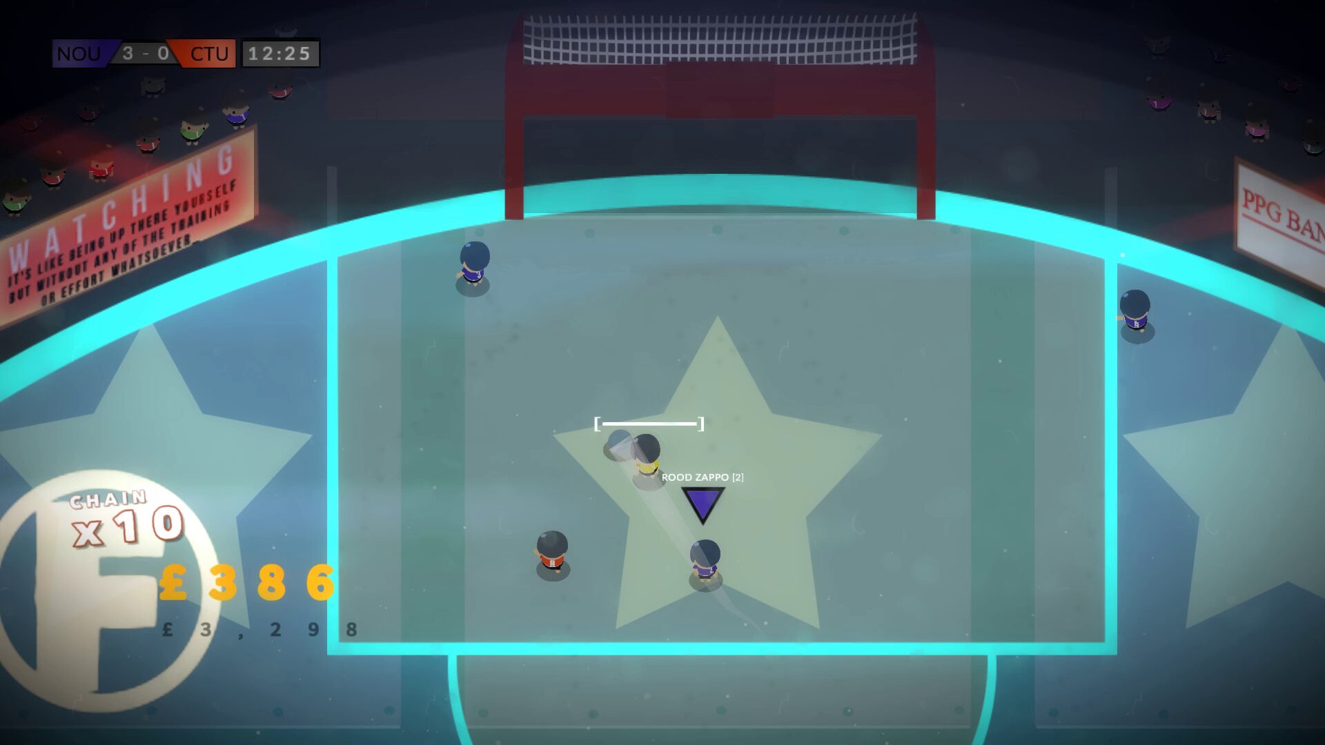 Goals come in three flavours, anything from within the goal area and penalty box counts as a single goal, from a bit further out (including near the corners) it counts as two, and from basically the other half of the pitch they count as three. As the kick strength is tied directly to the accuracy of the kick it’s rare (but not impossible) to land a triple goal, and definitely quite easy to land two-goals. The alternative however is often in walking in four goals early on (so you have a buffer against a lucky enemy kick) and then boot the ball around building up your frenzy score: the tracked statistic which definitely feels more important to the game than goals, if just because it results in money which can improve your teammates AI.