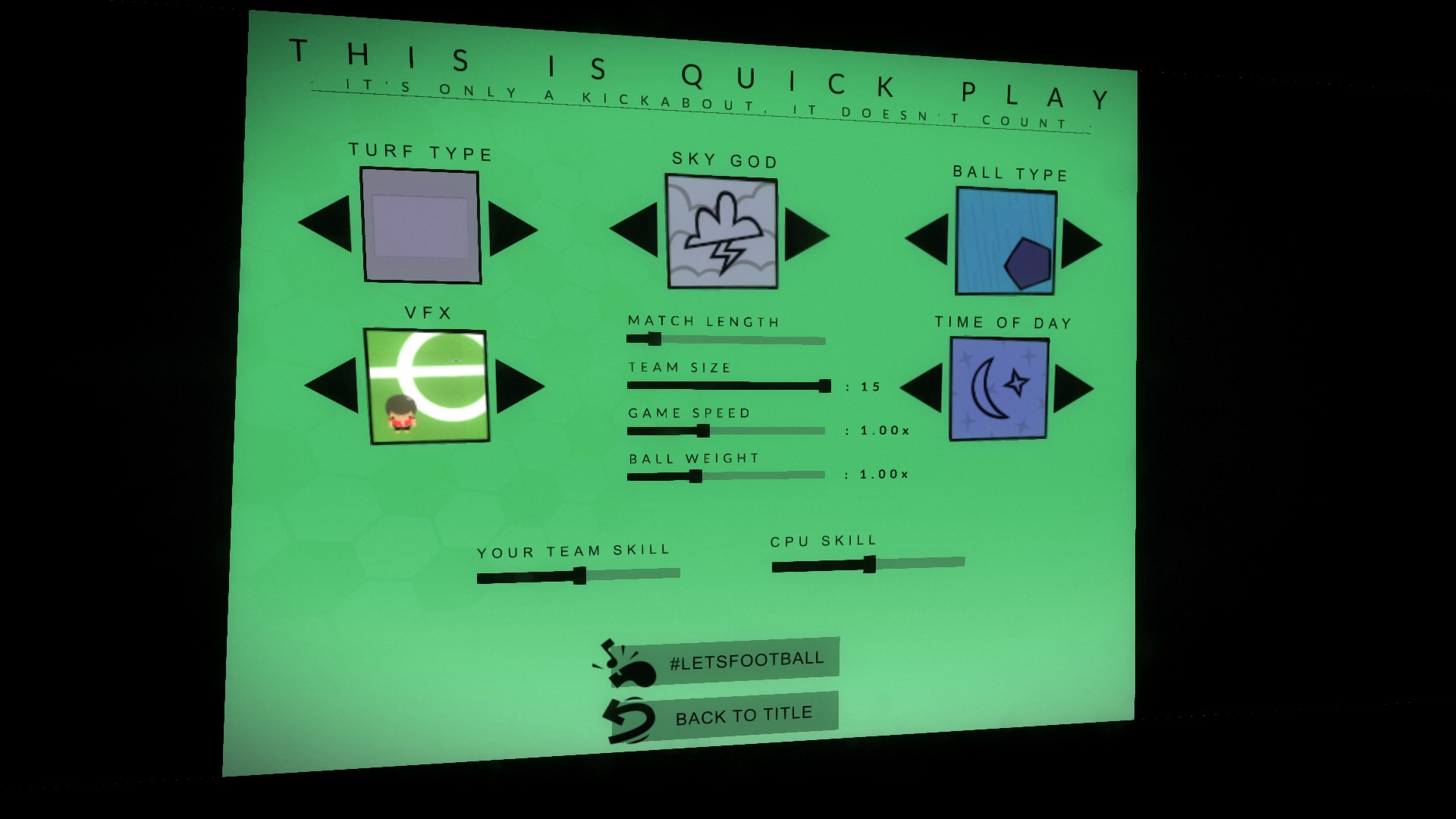 Thankfully gameplay is light and easy to control, even against more difficult enemies, with the main difficulty coming from heavy clusters of enemies. This is due not to the fact that units are desperate to touch the ball, but from the fact that the pitch isn’t really particularly large and the default team size is 9. Experimentation with the Quick-Play option reveals that the smaller size of 5 actually makes for a well paced game with lots of medium range passes, with interceptions feeling unexpected and very effective counters created. If you contrast this to the maximum team size of 15 -which, while fun, is basically the football equivalent of trying to cross a box-junction at 8:45AM on a school-day- then the difference is stark.