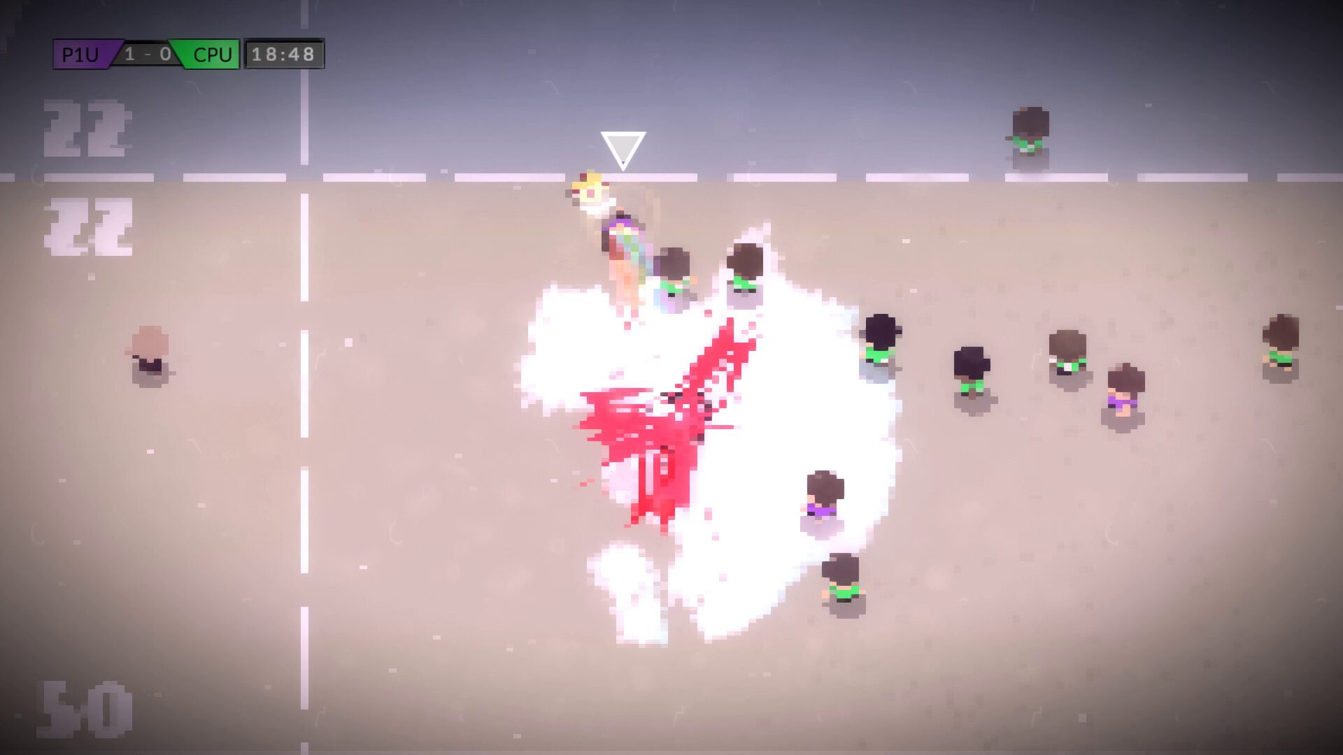 It’s been a joy to watch it all come together, and in the end has resulted in a game with a circular pitch, multi-goal scoring kicks, a multiplier-led score system, an offside rule which red-cards anyone with the ball in that half of the pitch when the timer runs out, and goalscorers landing a big smooch from the umpire when they do a big goal. All of that with a story, news ticker, and pitch billboards which channel Size Fives’ distinct, silly humour, as well as silly procedural team and player names (as the developer mastered in their last title The Swindle). There’s also an absolutely masterful soundtrack from Tobey Evans (you can hear it here )who was also behind the excellent one from The Swindle.