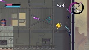 It’s a game that keeps pouring more, and more at you, essentially a bullet-hell platformer – rewarding your skill and awareness as you perfectly synch with the level, shredding the mechanised masses. As a matter of fact, with it’s extremely clean, minimalistic top screen UI, and the brutal pace it’s closer to a bullet hell than an action hack n slash – maybe a result of an elevator pitch of ‘Darius Burst meets Devil May Cry‘, but certainly a result of a lot of care from a very small, specialist team.