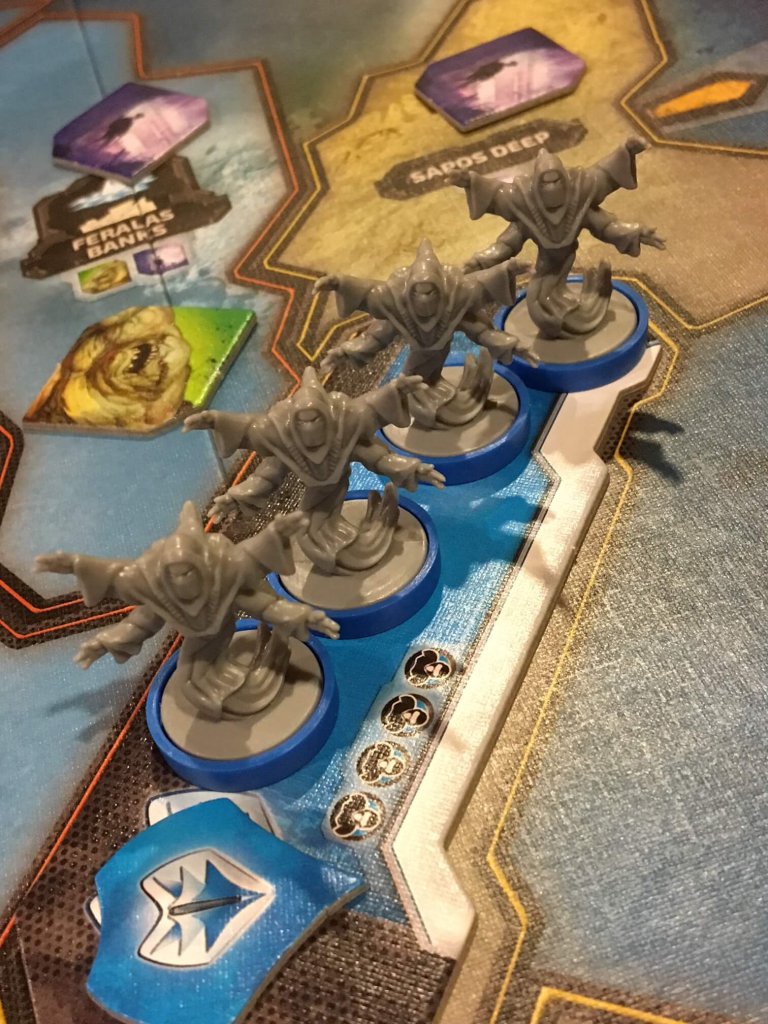 In addition to offering a lot of tactical choice, the board is also very active in Cry Havoc, enticing players to expand rapidly from their starting positions and forcing them into conflict frequently. It is not uncommon for the first round of actions to result in something like four or five individual battles in a four-player game. Every region features one or more tokens or crystals, the latter of which is part of the scoring mechanism within the game. Tokens on the other hand can do various things, with Trog tokens that can reinforce the Trog player (and often bring crystals of their own) and exploration tokens that will sometimes reinforce the faction that discovers them. Exploration tokens also sometimes spawn crystals or allow players to draw from one of four “neutral” card decks which contain additional, region-specific cards.