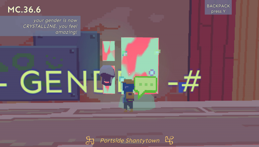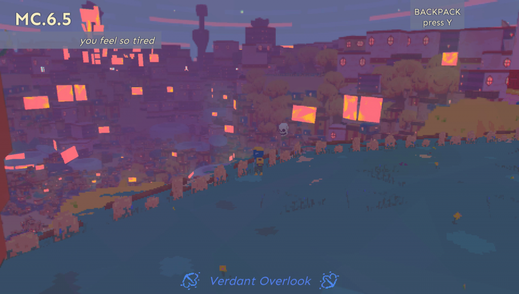 The most divisive thing about the game will probably be its art-style. Sundae Month have combined a three-dimensional world that you explore in third person with two-dimensional pixel characters, items and objects which can slip from view if they turn, or you angle the camera upwards. In my opinion it leads to some amazing views, as things smooth-off in the mid and far distances, versus the charming -almost retro- low-res look when up close. It’s also made in a combination of amazing contrasting colours, while also dabbling with pastel colours… something I’ve heard people describe as a little too alien for them. The developer’s remark on this with the graphics options in the launcher; Bad, or Worse.