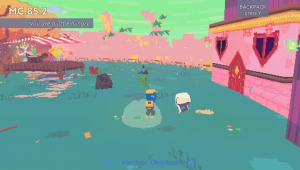 The most divisive thing about the game will probably be its art-style. Sundae Month have combined a three-dimensional world that you explore in third person with two-dimensional pixel characters, items and objects which can slip from view if they turn, or you angle the camera upwards. In my opinion it leads to some amazing views, as things smooth-off in the mid and far distances, versus the charming -almost retro- low-res look when up close. It’s also made in a combination of amazing contrasting colours, while also dabbling with pastel colours… something I’ve heard people describe as a little too alien for them. The developer’s remark on this with the graphics options in the launcher; Bad, or Worse.