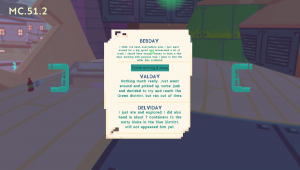 I say this because what I want to compare Diaries of a Spaceport Janitor to is a dungeon crawler RPG, but one with a massive, rich and populous town… and no dungeon crawling. As a matter of fact, the slice of the universe that we see in DoaSJ is easily one of the greatest hub-towns I’ve ever experience in an RPG supplanted into a game that isn’t an RPG. Market districts teem with noisy, bustling stalls, alleyways hide strange would-be quest givers, and thug-like guards pace the street exacting punishment on those they see as weaker and inferior. Which happens to be you, by the way.
