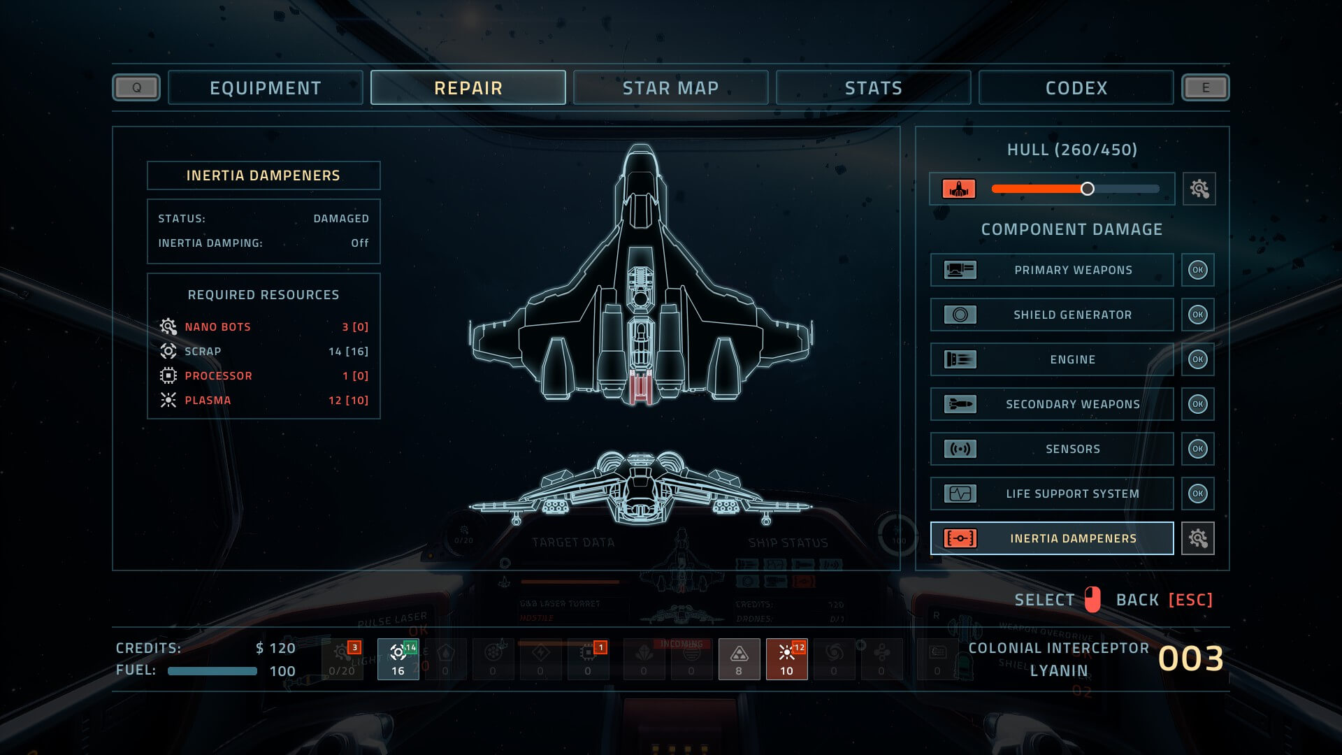 When the enemies are dispatched, then you can get on with surveying the rest of that particular area. There are all types of various things to find in the different sectors. Some items float around for you to pick up just by flying over/into them. Other articles need to be shot open before you can claim what is inside. One thing that is extremely fun to (try to) keep a handle on is that different parts of your ship can become damaged. It is not merely watching your shield and hull points. Besides those two are also: primary and secondary weapons; the shield generator; the engine; sensors; life support; and inertia dampeners. This is where your crafting comes into play. Hopefully, you have picked up the correct types, and the right quantity, of pieces of debris to repair the individual parts – in addition to your worries about the hull itself. You are the lone pilot out there. You do not have a crew to help you keep watch on, or help you repair, your ship.