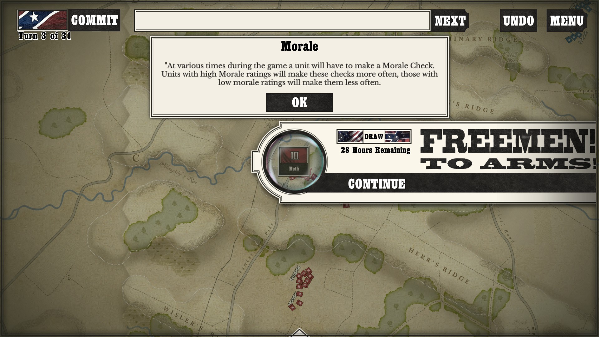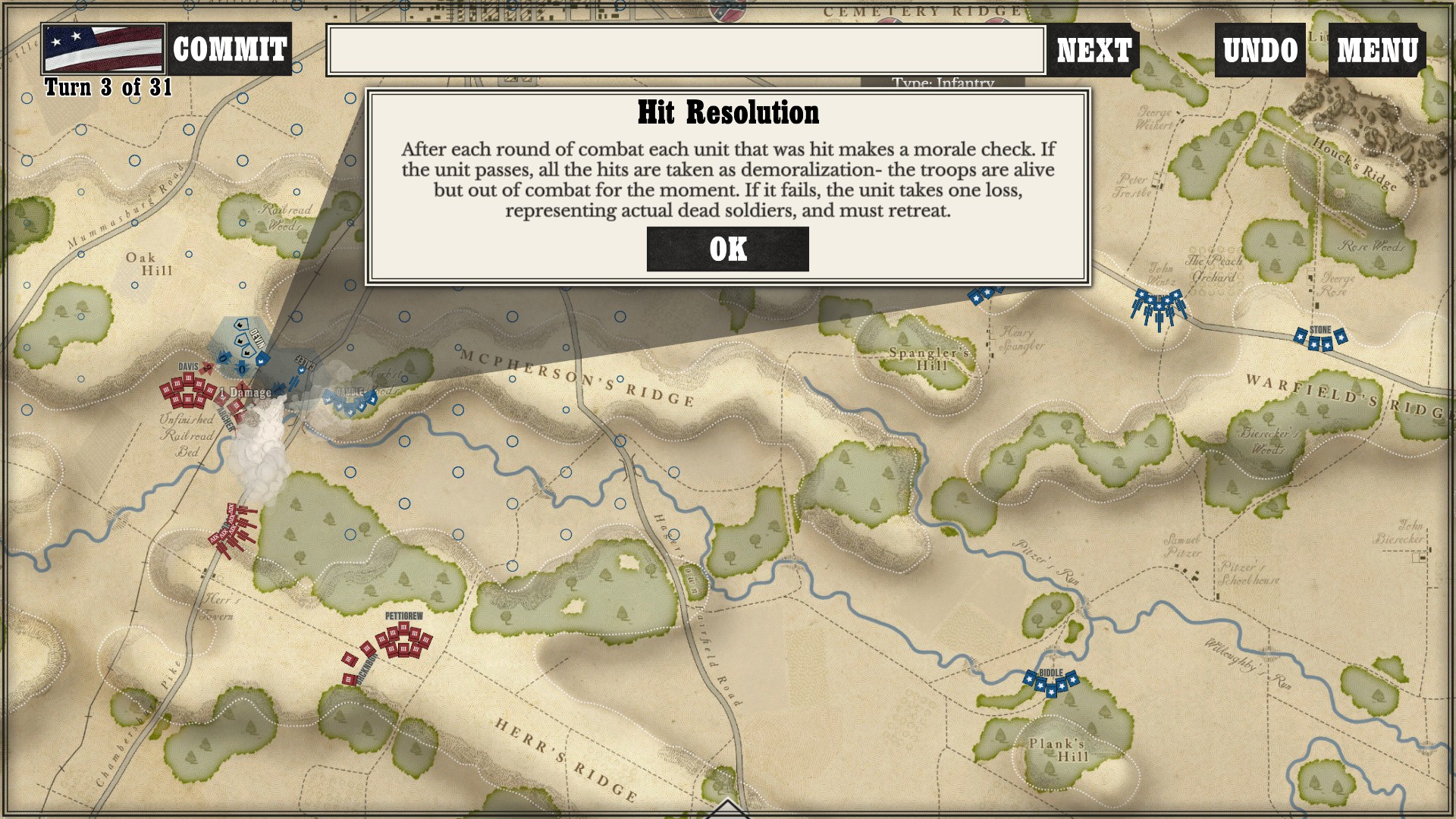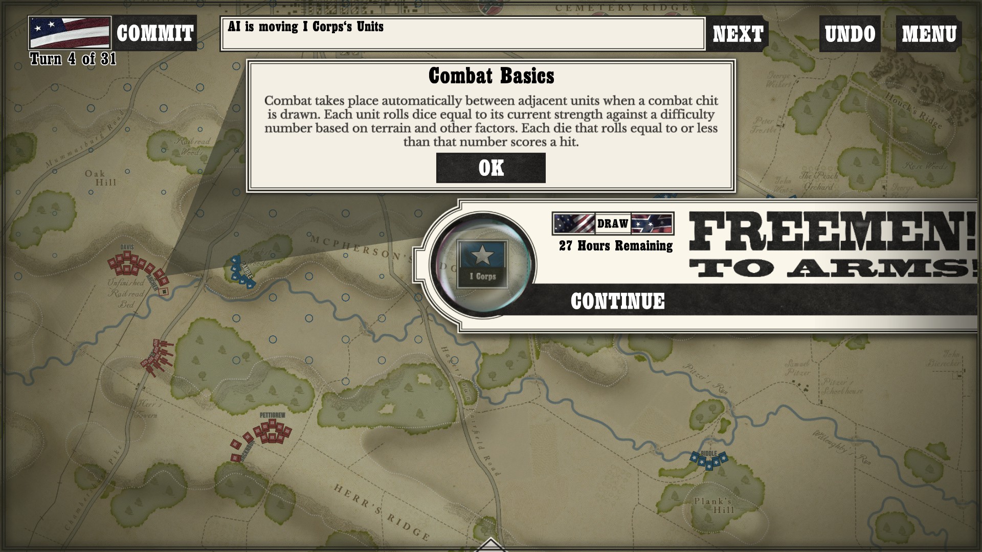 Gettysburg: the Tide Turns is easily a jump-in-and-play type of game. Every time I run across any kind of new game mechanic or information, a screen pops up to tell me what is going on. After I played my first campaign about halfway through as the South, I started a new one as the North to see if I would still get the same information screens. Three turns in, the only new information I got was about my horse artillery, which was new to me as I had not seen it while playing as the South (as far as I went in anyway).