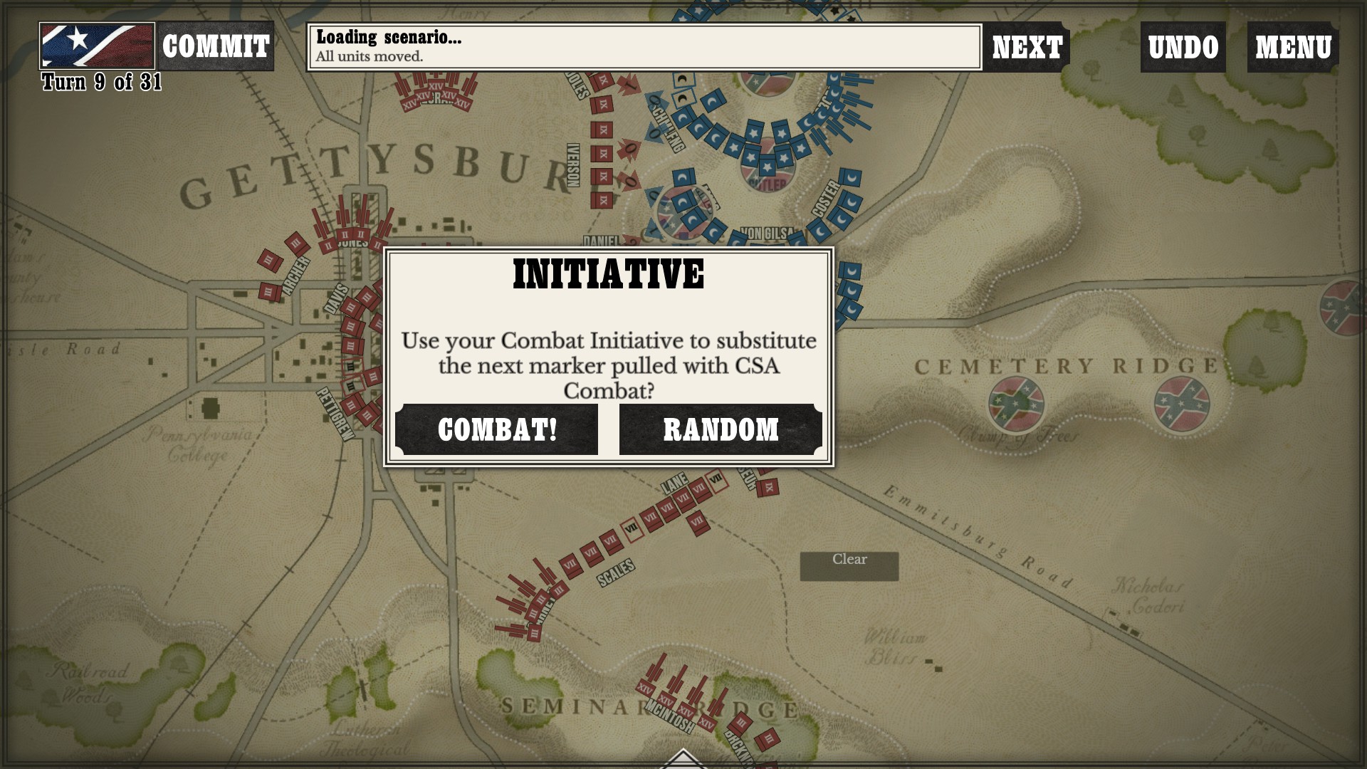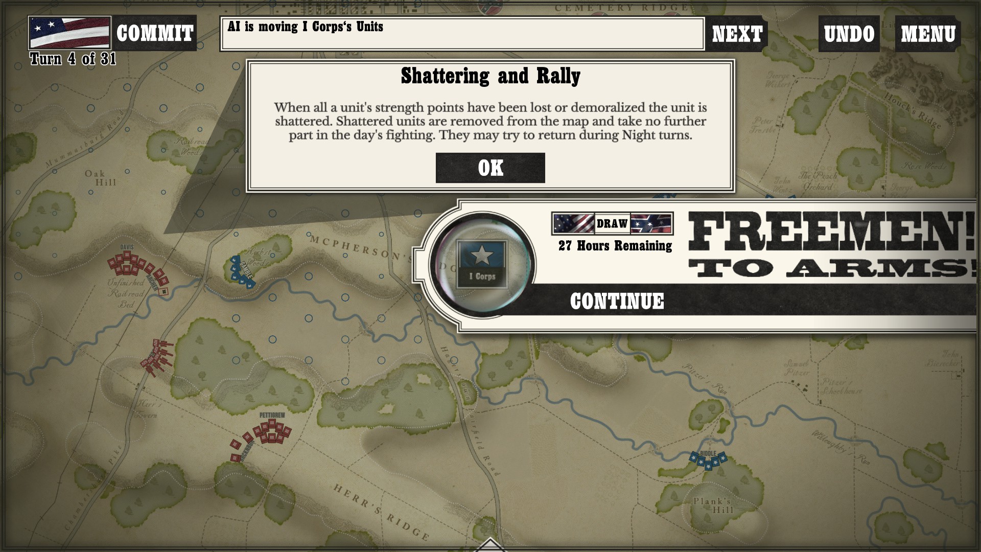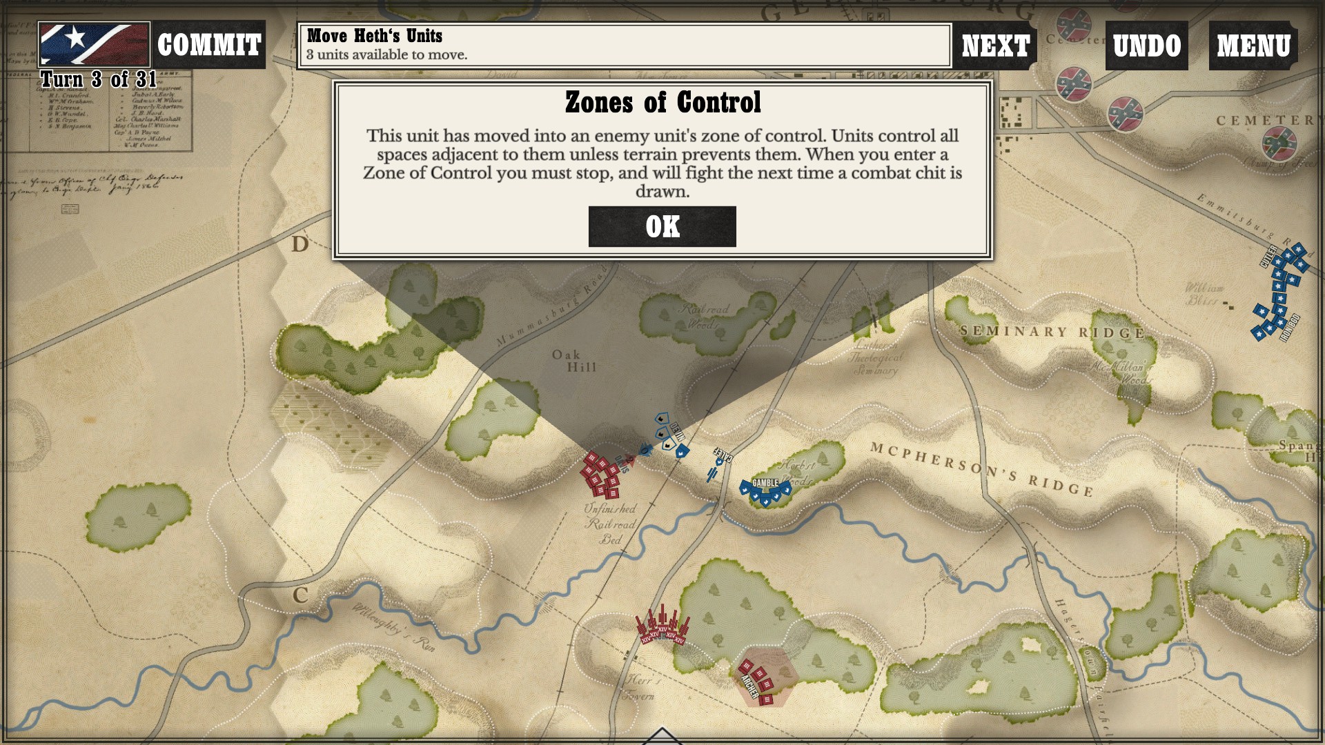 Gettysburg: the Tide Turns is easily a jump-in-and-play type of game. Every time I run across any kind of new game mechanic or information, a screen pops up to tell me what is going on. After I played my first campaign about halfway through as the South, I started a new one as the North to see if I would still get the same information screens. Three turns in, the only new information I got was about my horse artillery, which was new to me as I had not seen it while playing as the South (as far as I went in anyway).