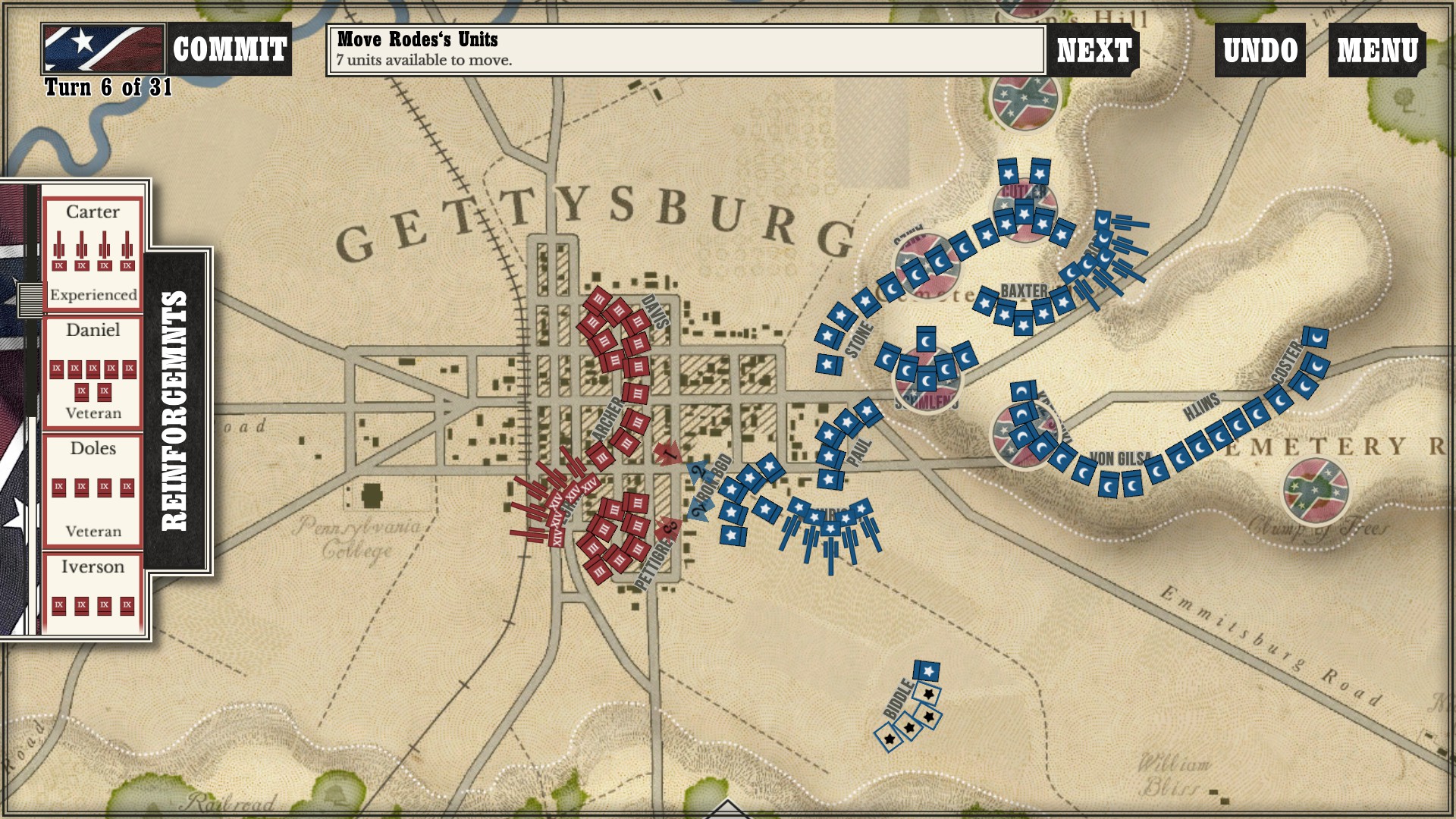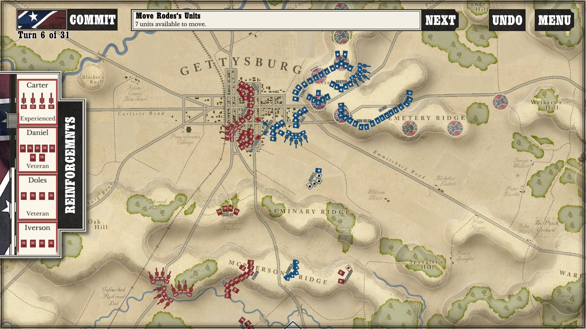 Gettysburg: the Tide Turns may be simplistic graphically, but there is quite a bit going on under the hood. After a few very minor bugs at release, Shenandoah and Slitherine seem to have gotten everything ironed out. Not long after it became available, they had already set up a tournament! While I may not be ready for that just yet, it is good to know that it is already to that level of competitiveness. I never experienced any crashes or turn freezes. The first thing that I have to do (as the South) is go back and see if I can claim the rest of the victory points from the hill. Then, I will turn my attention to my U.S. game and see if I can keep the Rebels at bay.