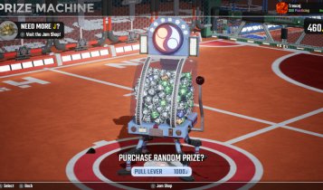 As you win games, you win J, the in-game currency. The only use of this is in the prize machine — for 1000 J, you get a random ball from a gacha machine. These contain skins, emblems, tags which are shown to other players online), discs and tickets. Tickets are a recent addition, as you get these if the prize machine would otherwise give you a duplicate item, so the fact that you do not get duplicates is a good thing. You can then use these tickets to directly purchase whichever skins, emblems and discs you want.