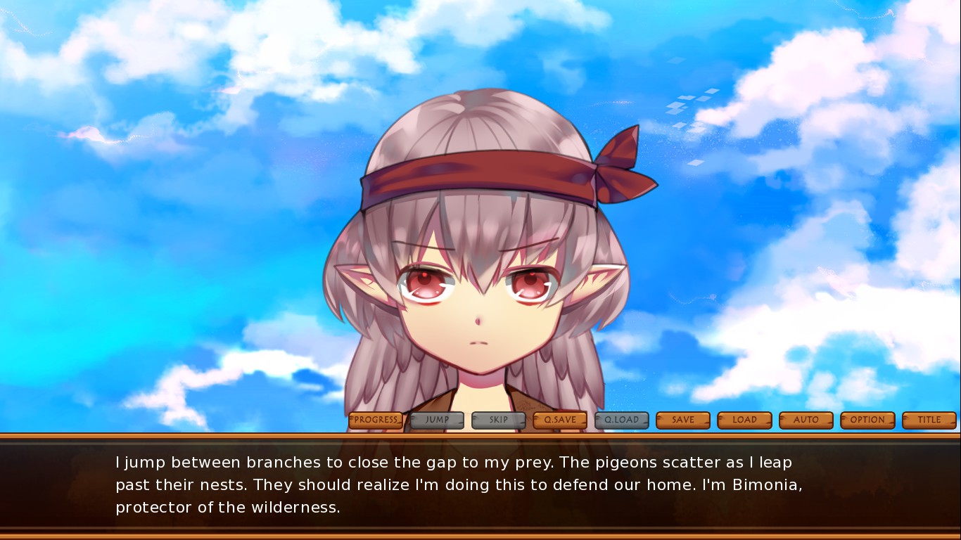 The story begins with Bimonia, a young birdling still learning the ways of her kind, coming upon a human in the forest. This is Tayo, who lives in the nearby village under the strict care of her mother. From there on, you get to play as each in turn, immersing yourself in the world of two young girls struggling to maintain a friendship against a history of war. When you eventually get into the characters’ minds and come to terms with some alarming mood swings, you can often empathise with them and find yourself touched by the adorable moments they share together.