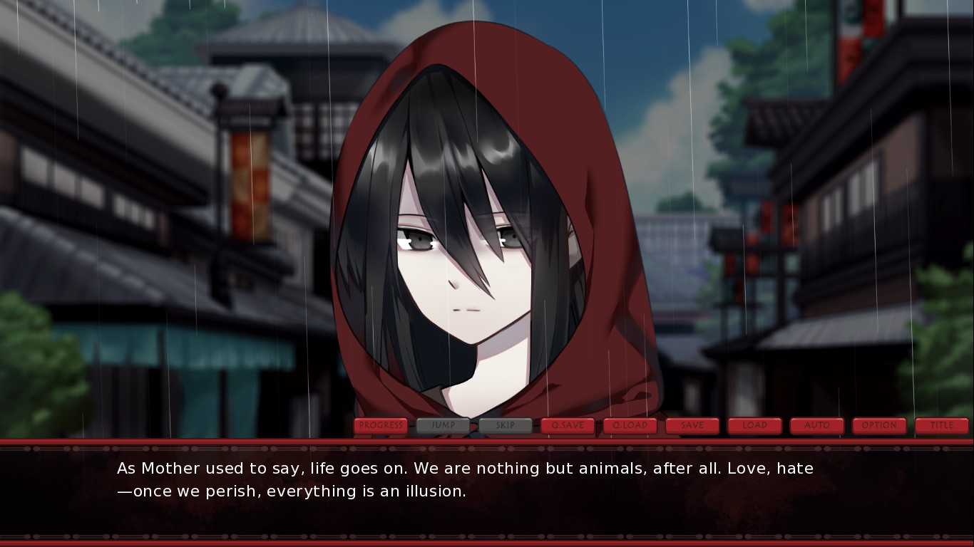 As a visual novel, its mechanics are simple — skipping from one piece of text to the next is as easy as clicking anywhere on the screen. Text itself is displayed in a clear font along the bottom, with a menu bar resting on top of it. This bar seems a bit cluttered because of both quick and normal save and load options which are probably more redundant than useful, but at least they’re easy to access, rather than hidden in a secondary menu.