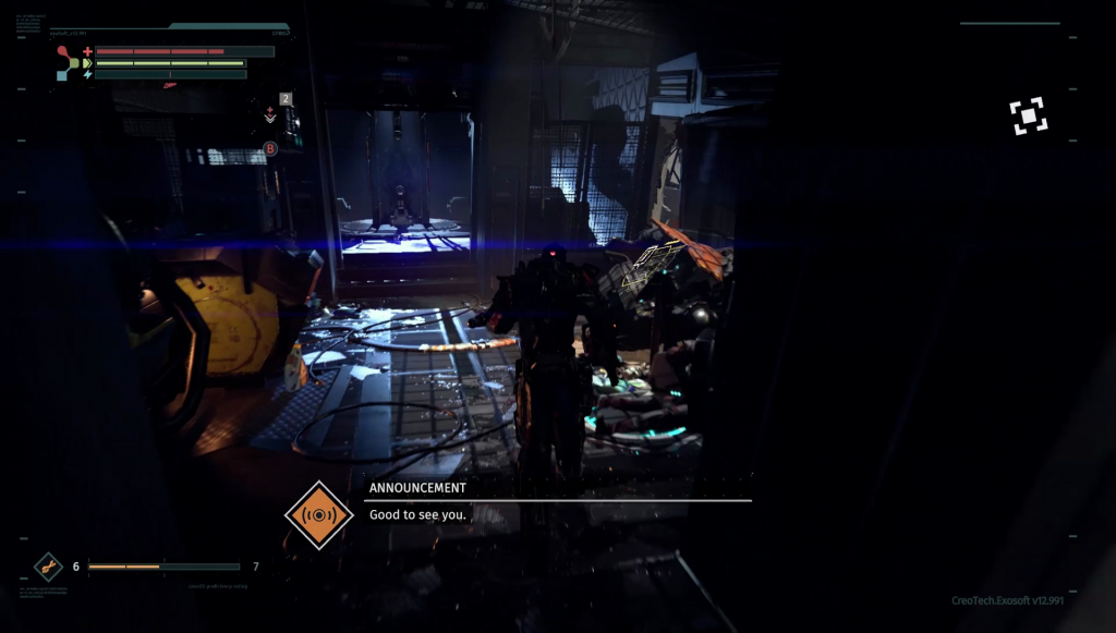 The MedBays serve as both your starting point within each of the various districts of CREO’s facility, as well as a hub that you’ll likely pass through half-a-dozen times even if you are incredibly adept. The main reason for this is that, as you explore through the ruined halls and smashed sky-ways, you will inevitably end up opening up shortcuts, repairing doors, and triggering enemies that open up new routes for you. All of these new, little paths allow you to quickly get back to where you last faltered in order to collect up the scrap you left behind when you fell, that or just get back to the MedBay to bank your winnings. When you respawn, or whenever you voluntarily return to the MedBays all enemies barring event enemies (guards, one-off machines, mid-bosses) and bosses respawn. Undeniably, for people who have much knowledge of Souls these little safe rooms, which are an area where you can level, communicate with (somewhat) friendlies, and work on your weapons, are not dissimilar to the muse’s bonfires; and the opening of shortcuts, and inherent confidence that forms from them, not wholly dissimilar to its level design either.