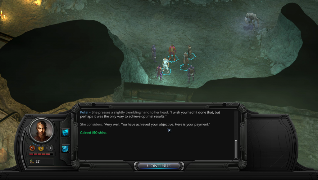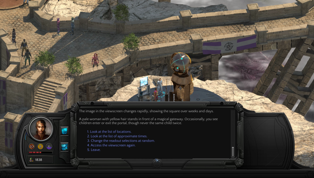 Advancing time, or simply repeat resting as to heal up, is not something that’s normally punished in games. I must have spent weeks in BGII’s starting dungeon as I rested and healed up after every encounter. In Tides however, time moving is almost always bad. An early quest sees a murder on the loose, and they will actively claim more victims as time passes, including a very likeable character. There’s also a companion who is tied to the time when you first meet them; a former colleague of theirs is being tortured, and may condemn the scoundrel (albeit, a likeable scoundrel) to death if allowed to die themselves (through the memory reading powers of the Dendra O’hua).