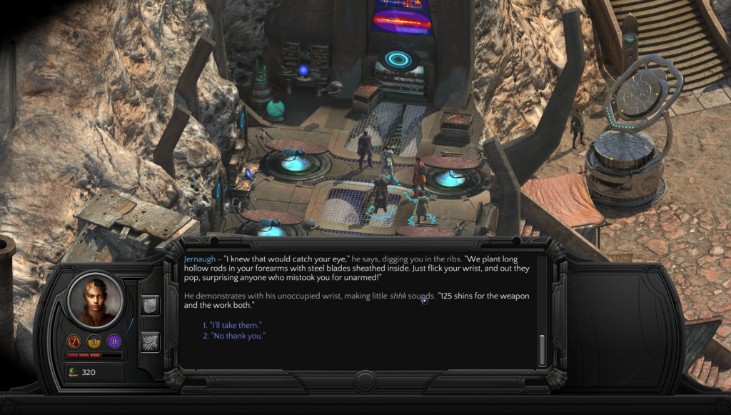 I’m a horder in most cRPGs, keeping a hold of anything of high value of potential use later in the game; this means that I’m the person who never uses potions because they might be more useful later. Tides’ characterisation of almost everything actually managed to shatter that. There’s little to spend money on if you’re thorough in the game; there’s a place where you can have major surgery to improve yourself – nanite blood, cool hidden-blades, an artificial eye. Aside from that however, many of the side-quest rewards are more powerful than the store-bought items, and so you’ll rarely be buying equipment.