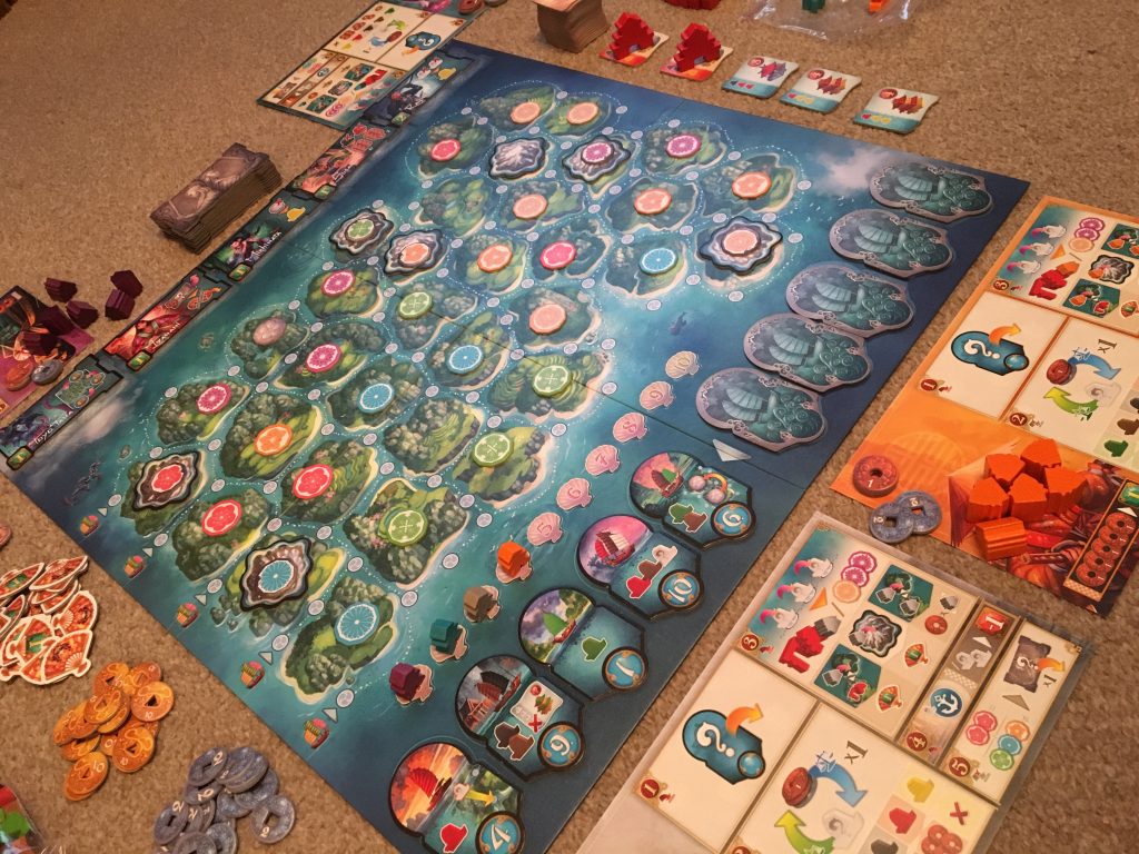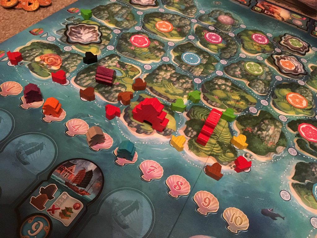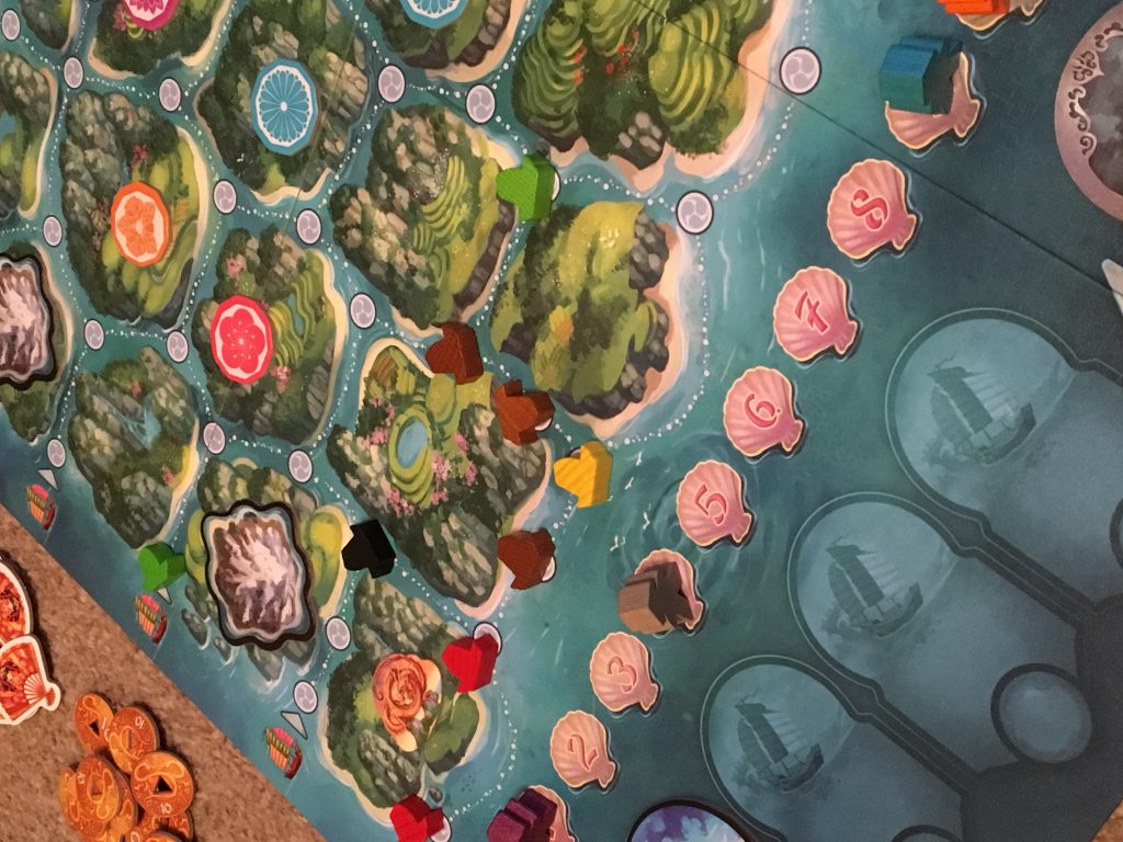Placing buildings is the main key to winning and as each structure is completed, the building token is placed face down next to the player card of the player who built it. There are monetary bonuses associated with completing buildings on adjacent islands or on mountains, as well as Prestige Point bonuses for building them next to one of the Palace or Torii prestige buildings, as long as the prestige building was constructed before the regular building. Trading Posts add an additional financial benefit over and above the normal grouping bonus.
