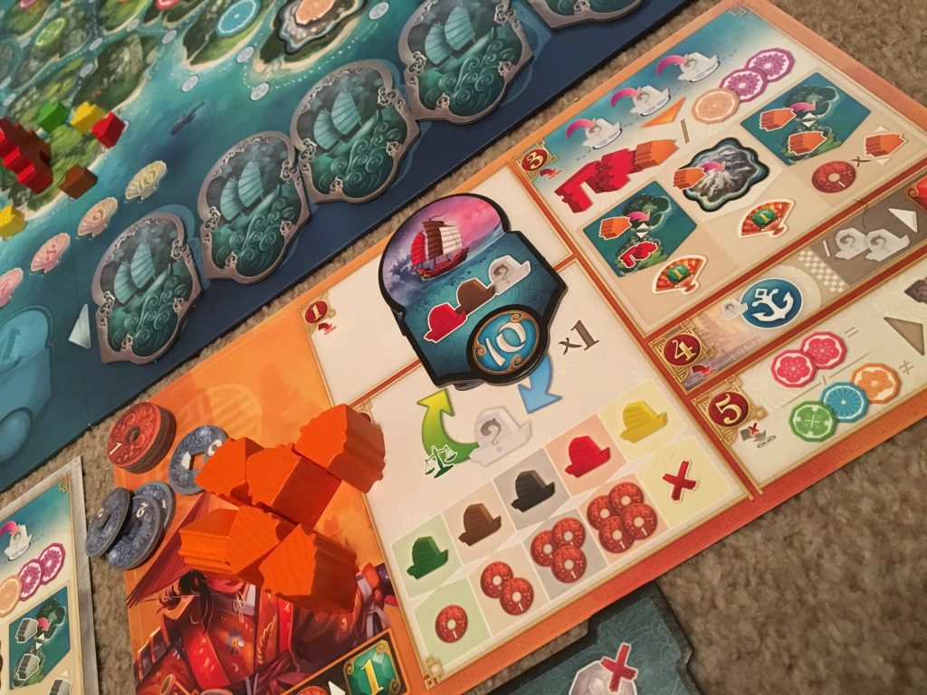 Available buildings are placed down the side of the board, and drawn from a face down stack when replenished, introducing an element of randomisation and forcing players to respond to an ever changing situation. Once all of the starting spaces are taken, players will need to match the colour of the previous ship in the chain before placing a new one, although when adding a second or third ship, the same player may add ships of any colour. In the event that a player has excess boats after placement, he or she may place one in reserve on the player board, but any excess ships beyond this must be scrapped, at a cost of one Prestige Point per pair at the end of the game.