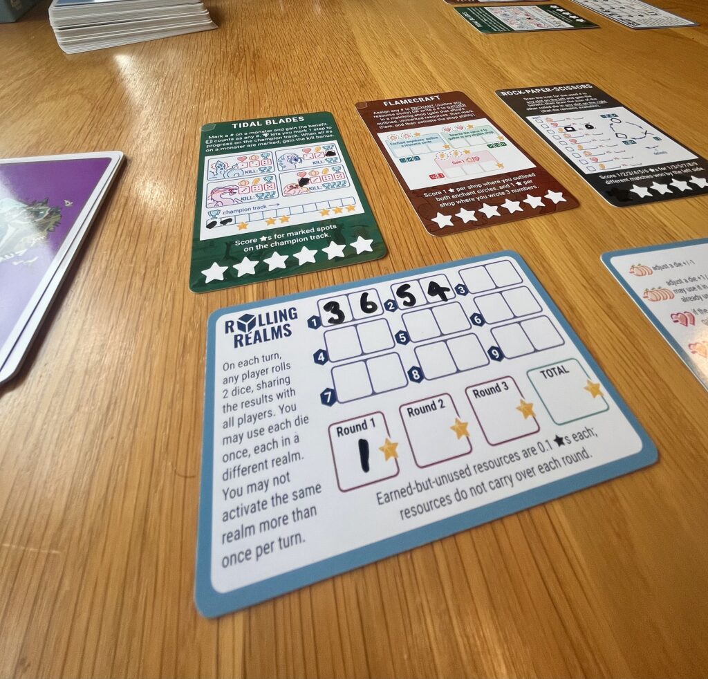 At its core Rolling Realms is a series of delightful little puzzles some more complex than others. To win players need to make the best use of the shared dice roll and their resources to tilt things in their favour. All the games we played were enjoyably close as everyone is working with the same numbers, but seeking to make better choices than rivals.