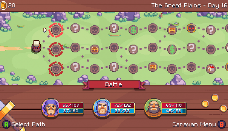 In the roguelike Royal Frontier, players assemble a three-class party to defend a caravan on its adventure to New Haven. Three maps depict the forty-five-day-long adventure, each map being a fifteen-day-long journey each offering three different travelling path options for the player to choose from with a boss match at the end of each map.