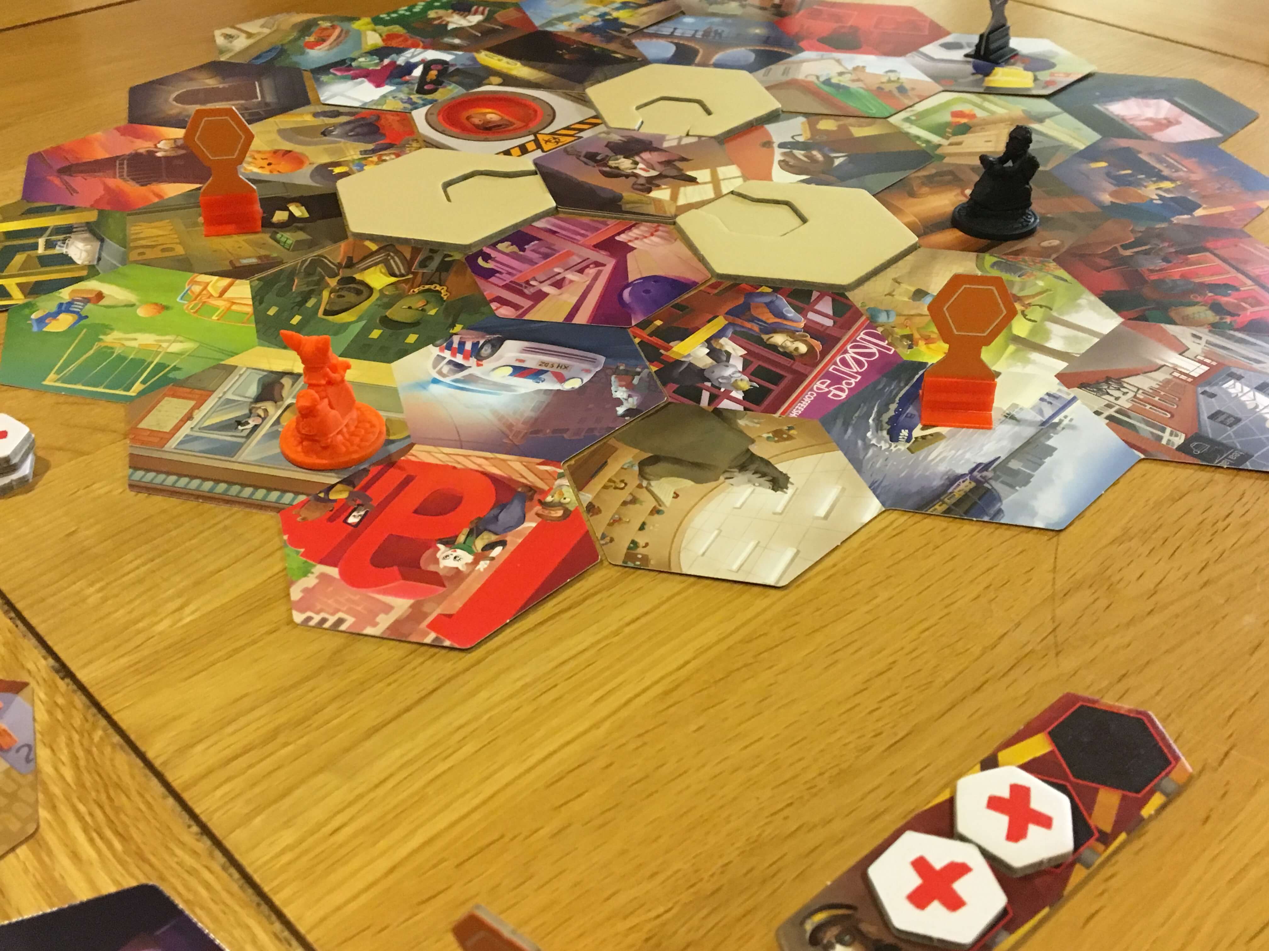 This is where Shadows introduces its own unique flavour, because each of the location tiles is different and the stack of them is huge, So, if an intelligence officer wants to move their team one space towards a red cafe with a bear in it, she might have to pick cards that feature red, or a bear, or something even more abstract like food, or a large mammal that is a similar colour. It all depends on what is available. Once the card (or cards, with the max being two) are shown, then the teammates must decide how to proceed. Once their move is confirmed, the intelligence officer confirms any consequences – be that collection of evidence or, on the downside, the need to collect a police warning.
