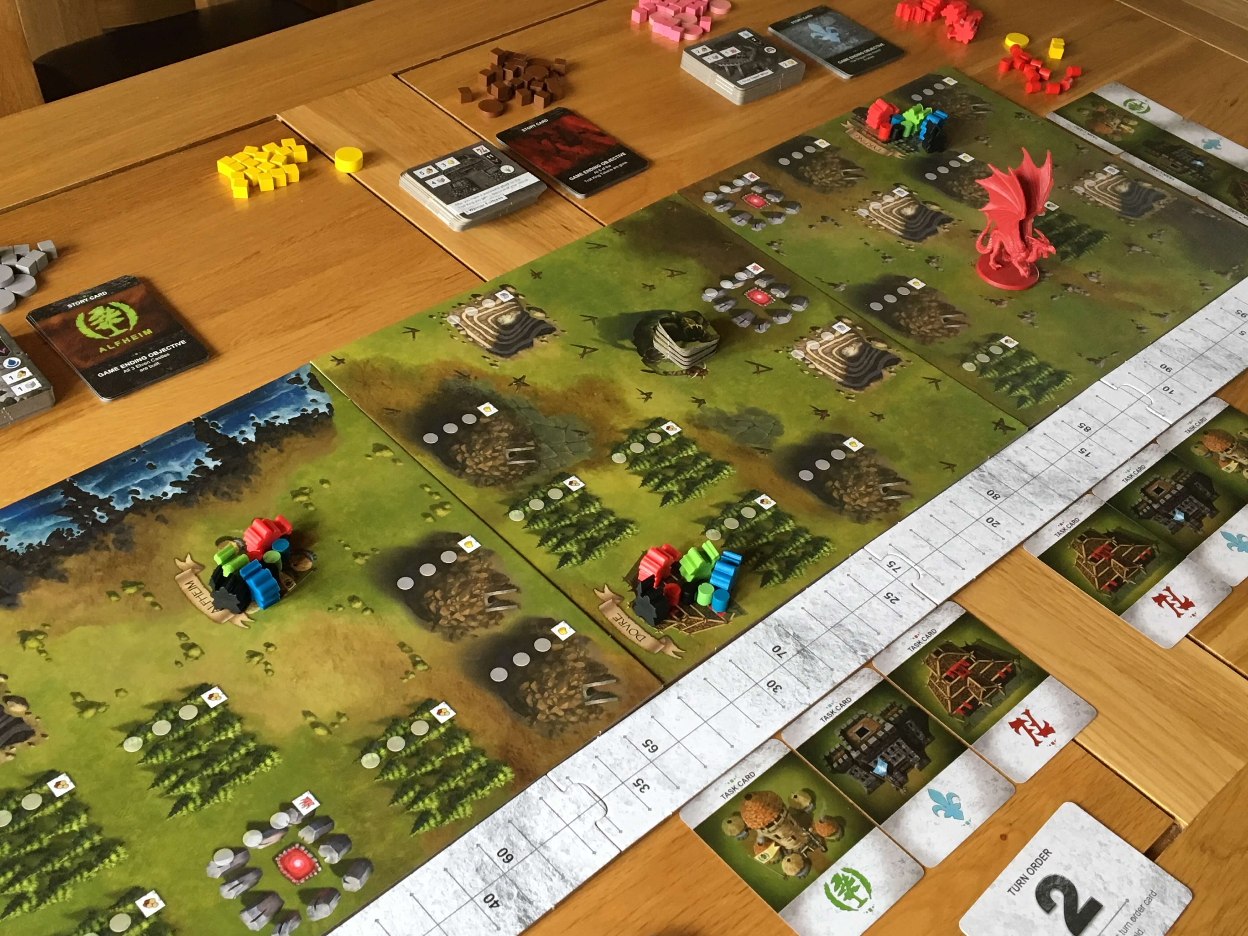 The other focus of your attention will be on the story cards and there is a deck of these for each realm. Some of these resolve effects directly in the realm itself — for example they might move the dragon which plagues the dwarven realm of Tyrfing, whilst other cards can be kept by the player to either resolve later, or to place in front of them for some benefit (usually victory points or resources.) Because all of the players (of which there can be two to four) will be chasing the different victory conditions, the game does have a pretty finite timer and usually lasts no more than an hour.
