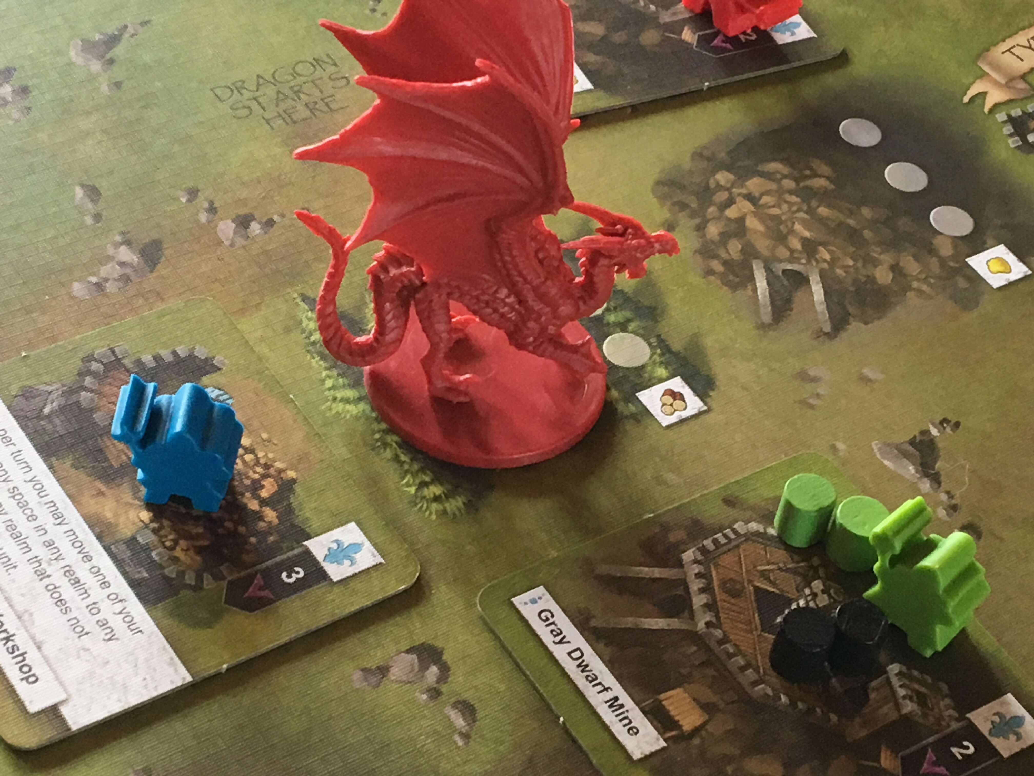 Whilst Shifting Realms is produced to perhaps a slightly lower standard than some of the ultra premium games that we see nowadays, it still looks excellent when set up on the table and has some standout features that I really like. Most of the setup depends on the realms that are in play and different combinations result in different levels of table appeal. Tyrfing, for example, features an excellent sculpt of a dragon, whilst the orc realm of Dovre features a stack of tokens that represent the spoils of the Troll King. Alfheim and Liberthasia are the only realms with water spaces that represent the coast, which is also a nice touch.