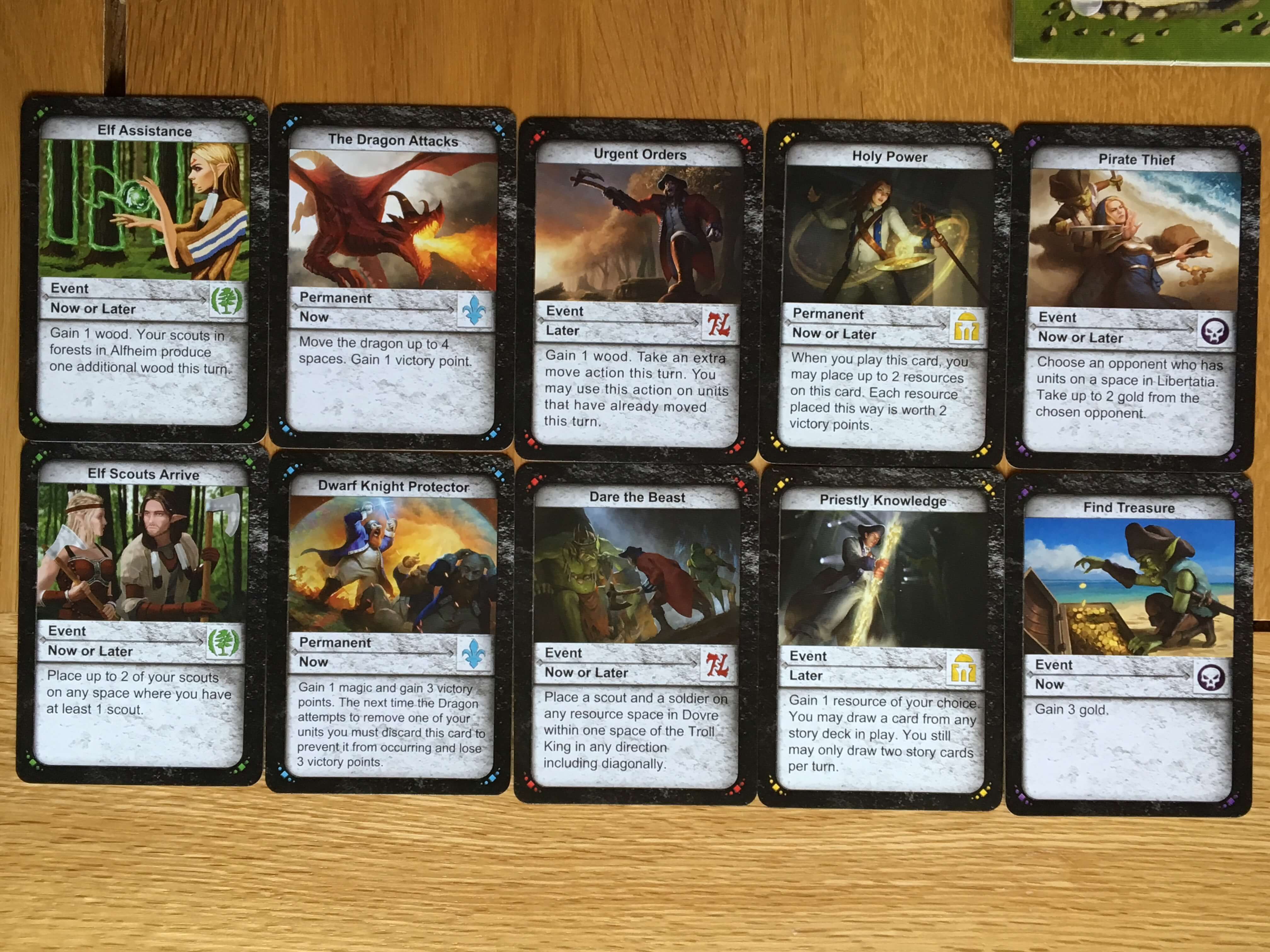 Building is marginally more complex, but still very straightforward. Firstly, the player must assess which building they can afford and then pay the cost (which is shown on the back, grey side.) Each building can only be constructed in the realm that it relates to and in the location that is indicated by its type (so a mine can only be built over gold, for example.) The player then places one of their scouts on it to indicate that it is their building (at least for now.) Buildings can be placed in spaces either occupied by or adjacent to their troops, or adjacent to their existing buildings. Drawing story cards is simple — take a card for each action (up to two) from any of the three realms in play and then action what it says on it.