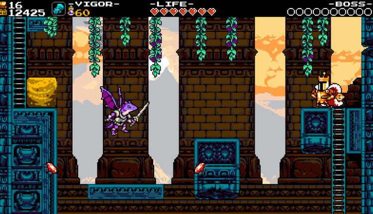 As you move through a level as King Knight, you will often find yourself in a situation where you need to move upwards vertically, as a platform is out of reach. Serving as both his primary weapon and an effective means of transportation, the King’s shoulder bash launches him up in the air after hitting either an enemy, causing him to spin, which you can then use to bounce off a conveniently placed set piece or a designated wall surface and bounce up to that previously unreachable path. While he’s in the air after a bash, you can also continue his ‘spinning strike’ by landing on another enemy — or set piece — to continue to bounce across the screen and eventually land on a platform. Once a spin-strike is completed, you regain your ability to dash again, providing multiple options and nuances to your trajectory. There’s a lot of mental calculations to carry out when you are attempting to maneuver your spinning hero to solid ground, and with you constantly doing all of these acrobatics over open chasms, it takes the simple ‘A to B’ destination formula and makes each screen its own puzzle.