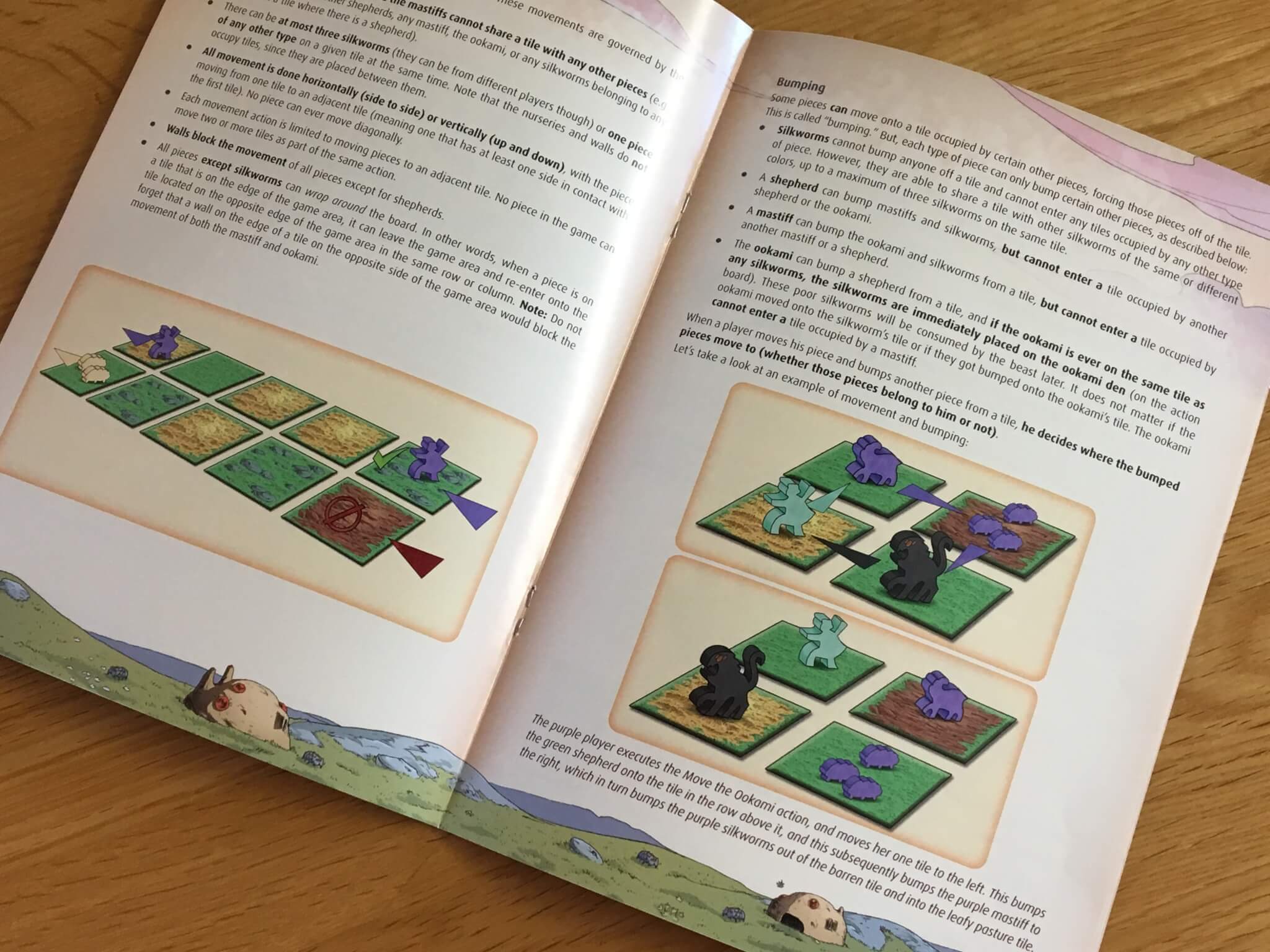 Whilst I mentioned earlier that Silk comes in a smallish box and has some superb artwork, I should also mention that the component quality here is absolutely fantastic and there is a lot in the box given its size. I haven’t encountered Devir Games before, but the quality of the wooden shepherds, the mastiffs and the Ookami is excellent and the pieces are very finely cut. The silkworms, fences and nurseries are also made from wood and of excellent quality, and the board pieces are thick cut card. The manual is filled with evocative artwork and in general, is very well written and informative.