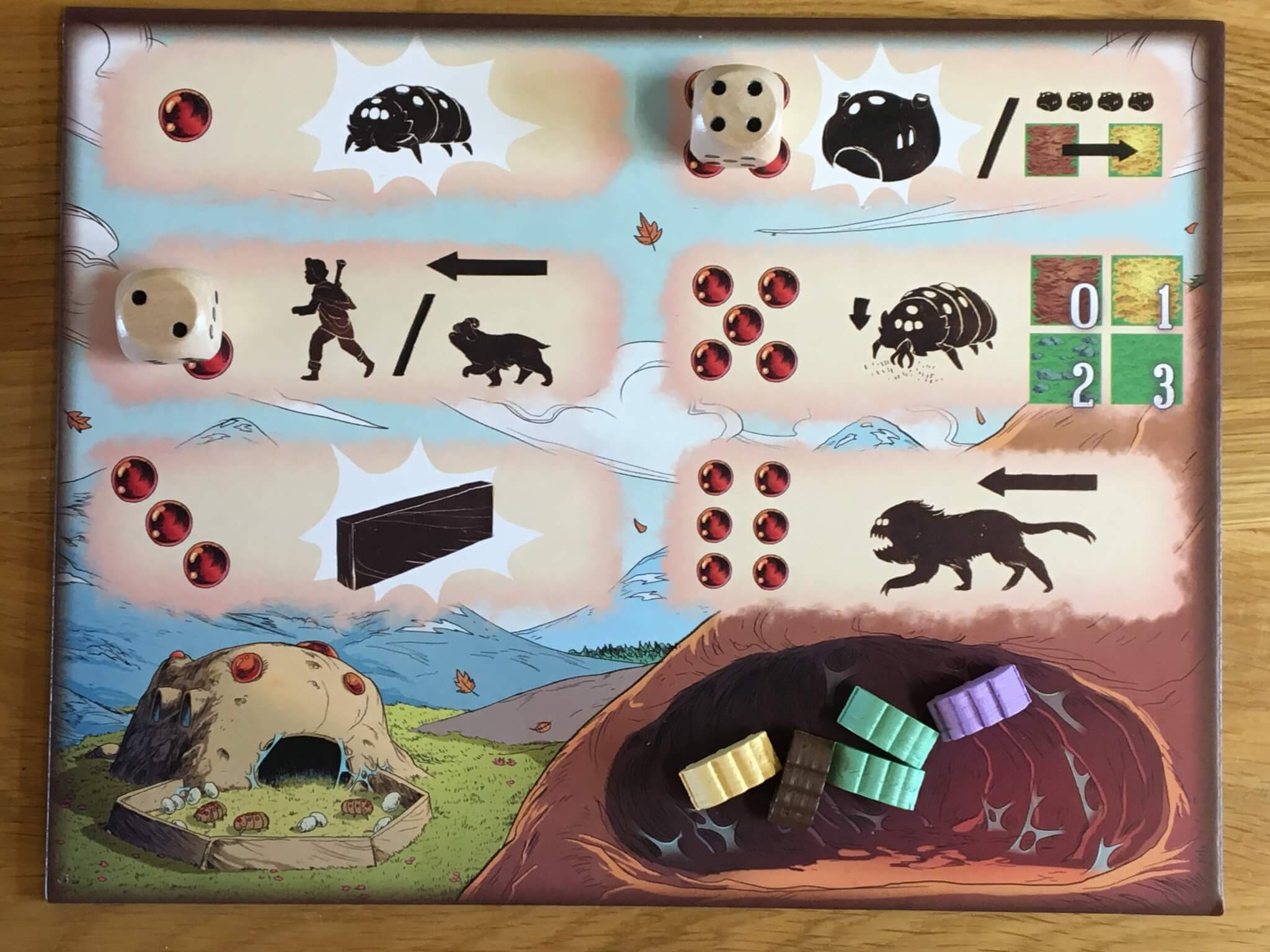 Structurally, Silk is very appealing even at a basic level. The players will jostle to get their silkworms into the richest regions and will compete to try and protect them from the Ookami by placing fences and using their mastiff piece carefully. At some point though, repeated harvests will flip the board tiles to their barren side and force the players to venture outwards into danger. Smart use of the Ookami is essential, but thanks to the dice based action selection system, it’s not something that a player could rely on as their sole strategy.