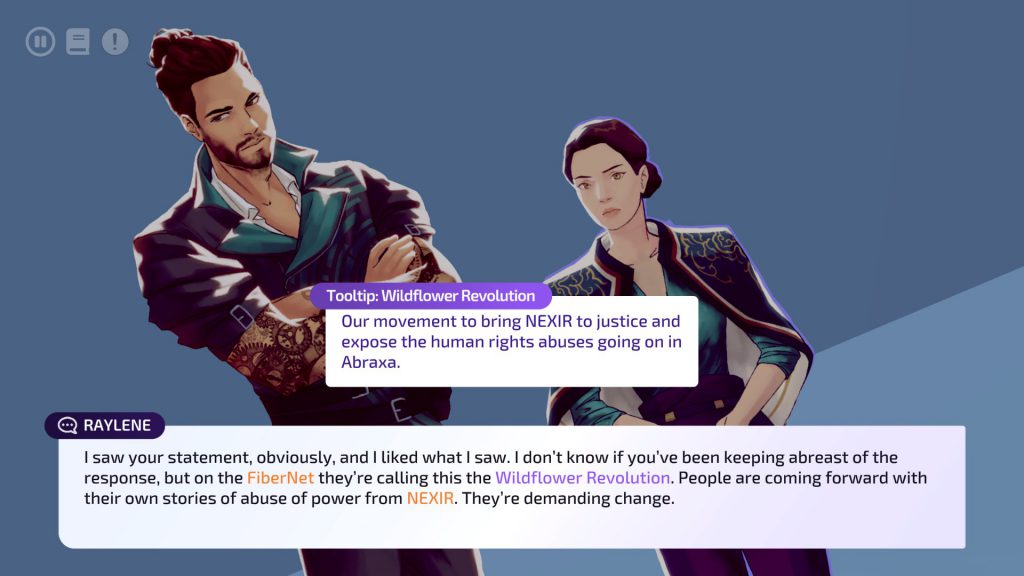 There are a lot of things to love about Solace State, but I think the one thing that sticks with me the most — even more than the damn good, emotional writing — is how much care was put into writing the different classes. The working class, the middle class and the upper, political class are identifiable without even clicking on their names to activate their info-panel tooltip. The fact that a major potential political ally speaks in riddle-like idioms that are beyond the highly-educated, university graduate protagonists is an amazing piece of writing that very quickly betrays the elitist, private education that the individual received. That attention to detail, and careful design, was amazing. The moment the character started talking, a part of my poor, working-class child heart sent a message to my brain to not trust them… there’s some real magic in writing that can do that.
