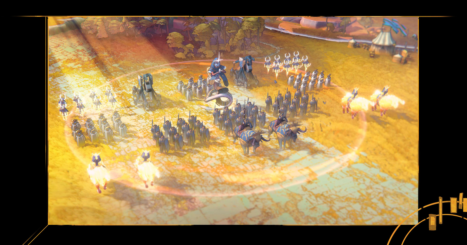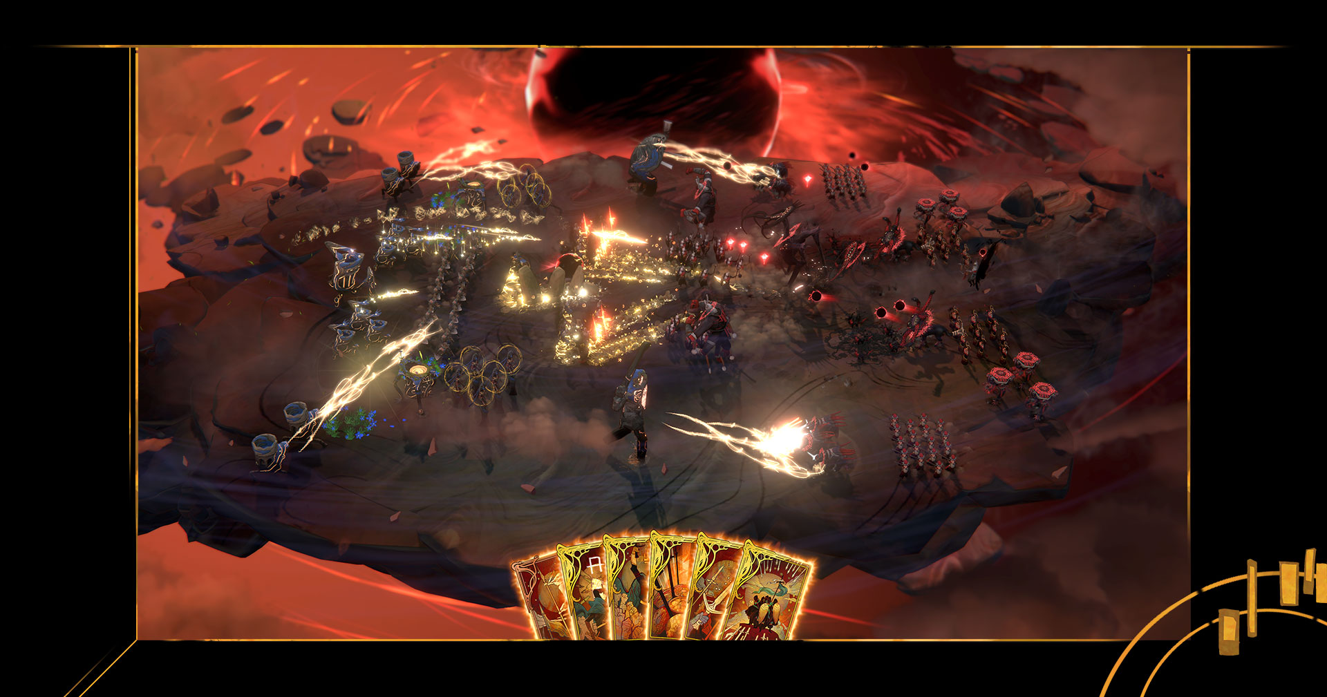 As the player, we’ll receive a small hand of cards that enable us to influence the battlefield. Some cards allow us to force a specific unit to retreat, others might replenish wounds and revive fallen units. Some deal direct damage or even summon completely new, celestial units onto the battlefield. All of these cards will influence the outcome, but you honestly don’t feel like you have any direct control over the outcome — and that’s simply because you don’t.