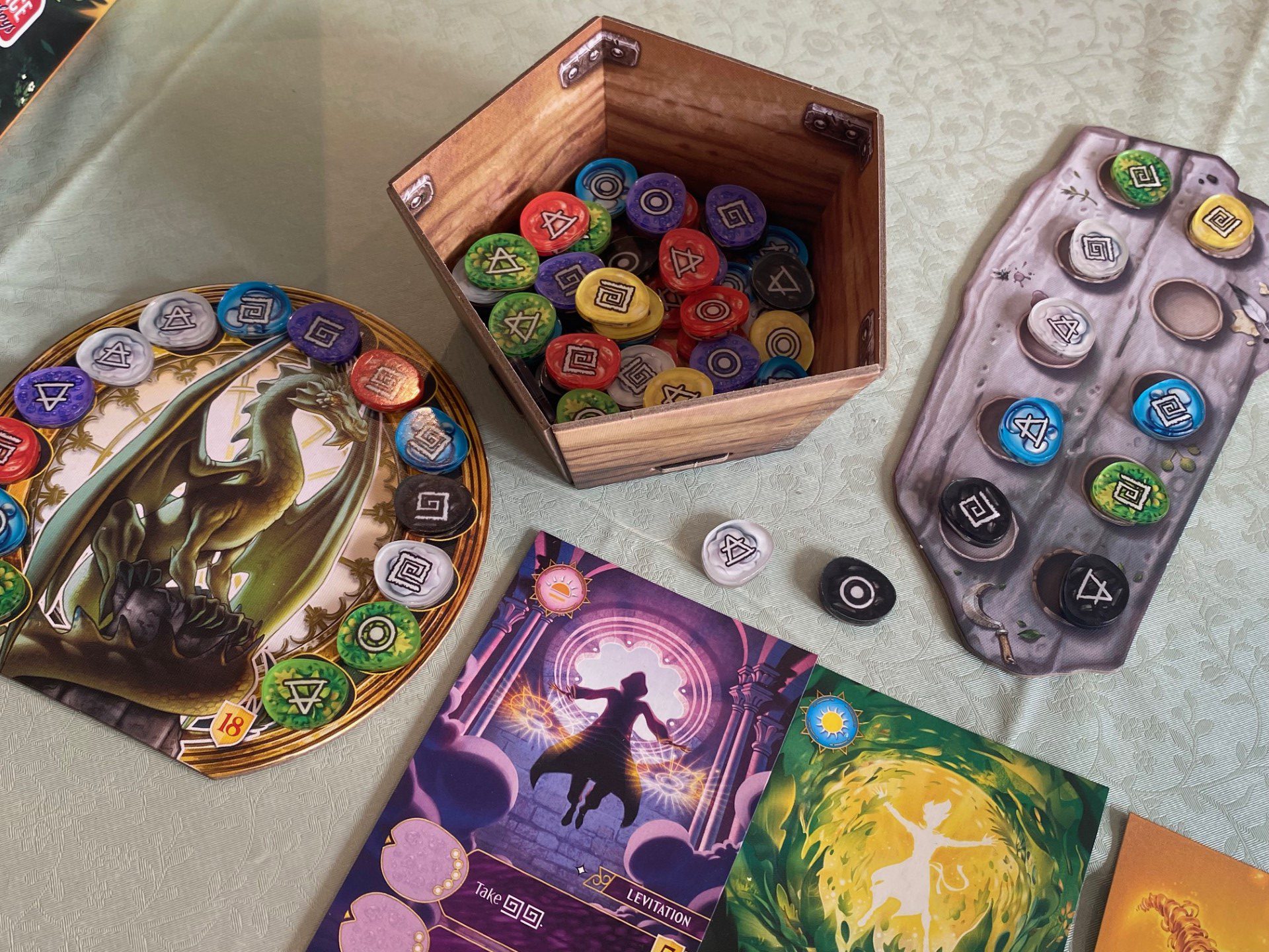 When the game begins, players will have their seven spells placed in front of them, as well as a “Familiar Board” and a couple of materia tokens. Materia tokens are variously coloured pieces which players will use to cast their spells, and Spellbook uses bright, plastic chips that look really nice and should last quite well over repeated plays. In the middle of the table will be a materia bag (including a lovely printed image) and a discard bucket, which is where materia goes once it is spent.