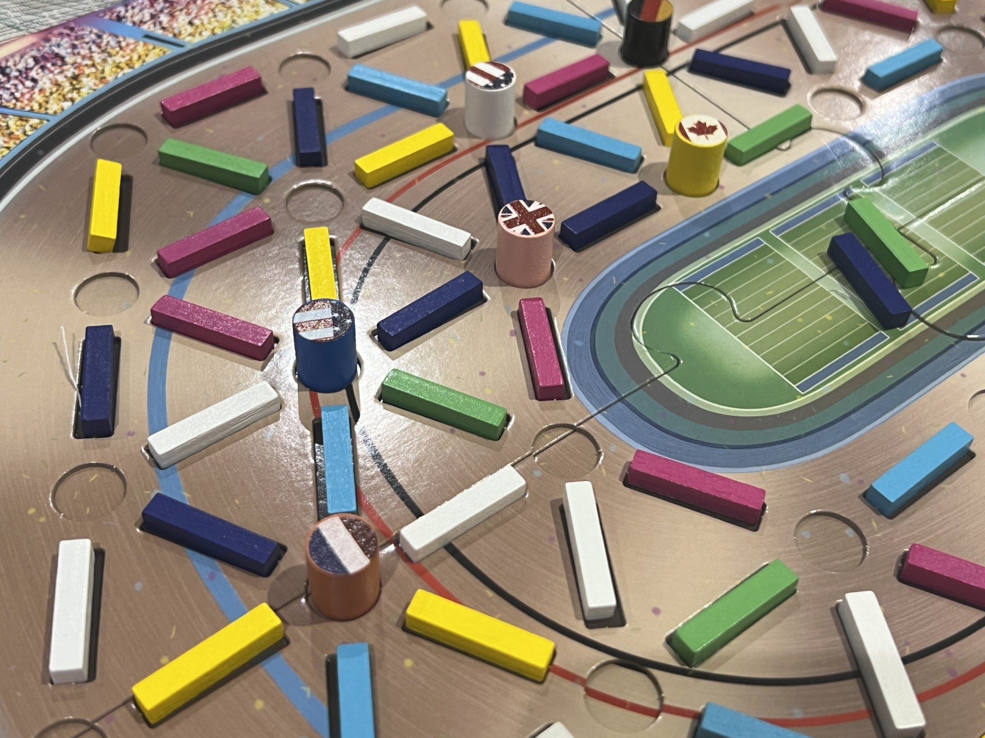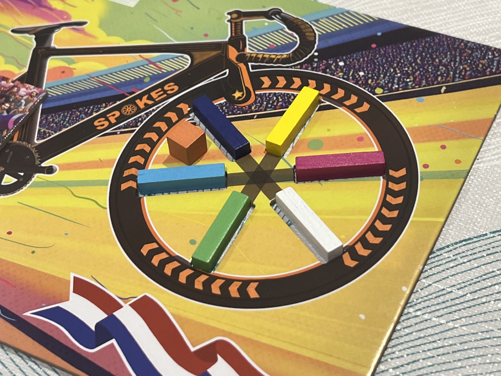At its core, Spokes is all about manipulating the spokes of a wheel on your own player board to move your bike token around an oval velodrome. You do this by moving a cube on your board one to three spaces, jumping over spokes of six different colours until you choose to stop. When you do, you’ll pick up the spoke you just jumped over and place it onto the board, replacing an existing spoke piece of any colour.