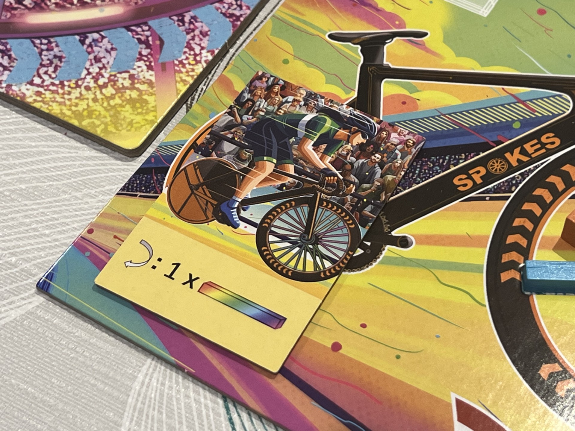 Production-wise, Radical 8 tends to favour bright, functional components that emphasise clarity over spectacle, and Spokes follows that philosophy. The bike wheel player boards are bright and visually striking without being cluttered, and the iconography is straightforward. The velodrome (presented as four jigsaw style interlocking pieces) is superb, with excellent colours and standout use of a dual-layer production method that means the spokes and bike tokens sit perfectly where they should.