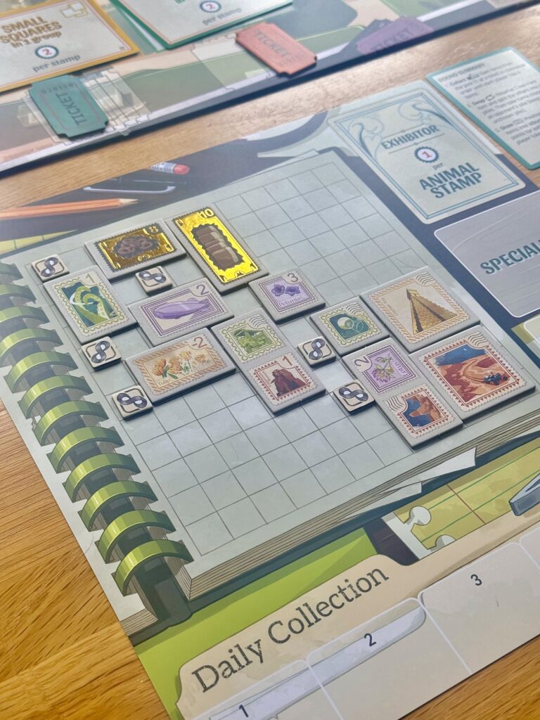 Placing the stamps on your grid is an engaging puzzle as you try and balance your existing collection with the goals on offer and what you may acquire in future rounds. Do you keep that dog stamp in your animal theme group or is it better of in the corner where you are working on as many yellow stamps as possible because you noticed another player going for animals but no one’s hitting yellow hard yet.