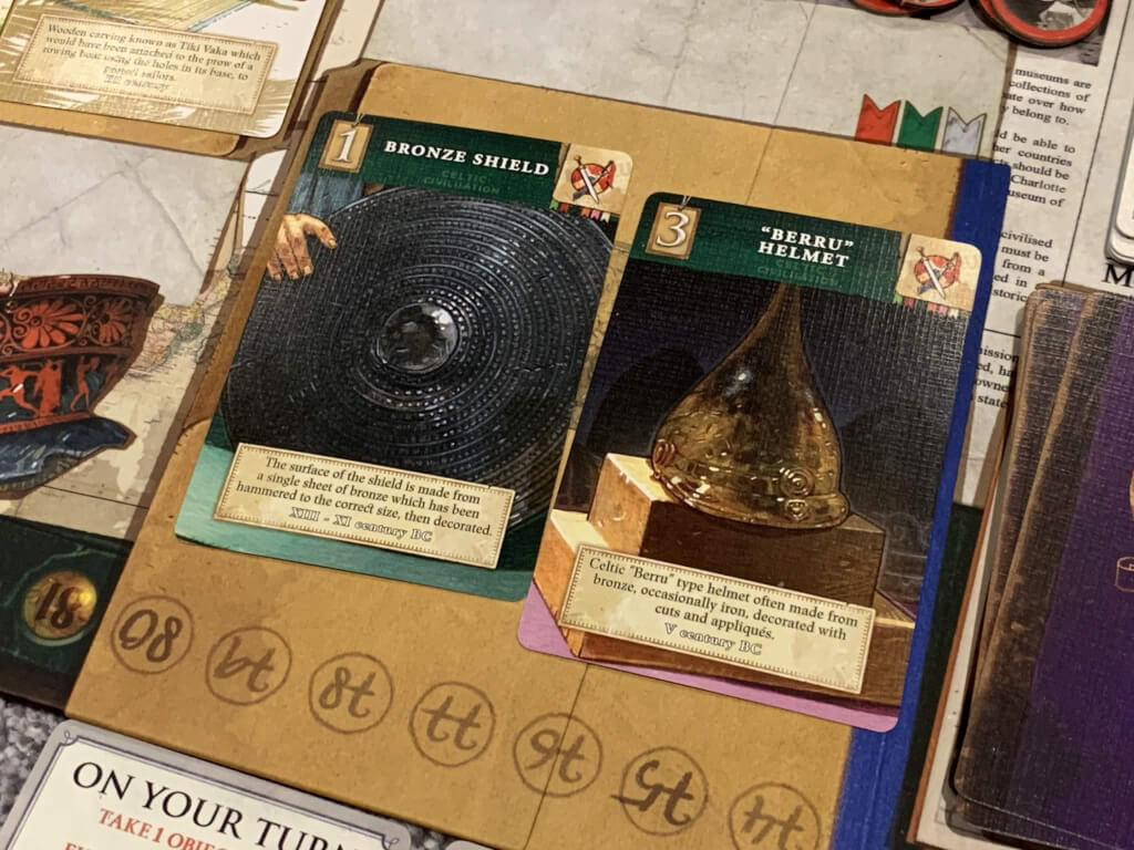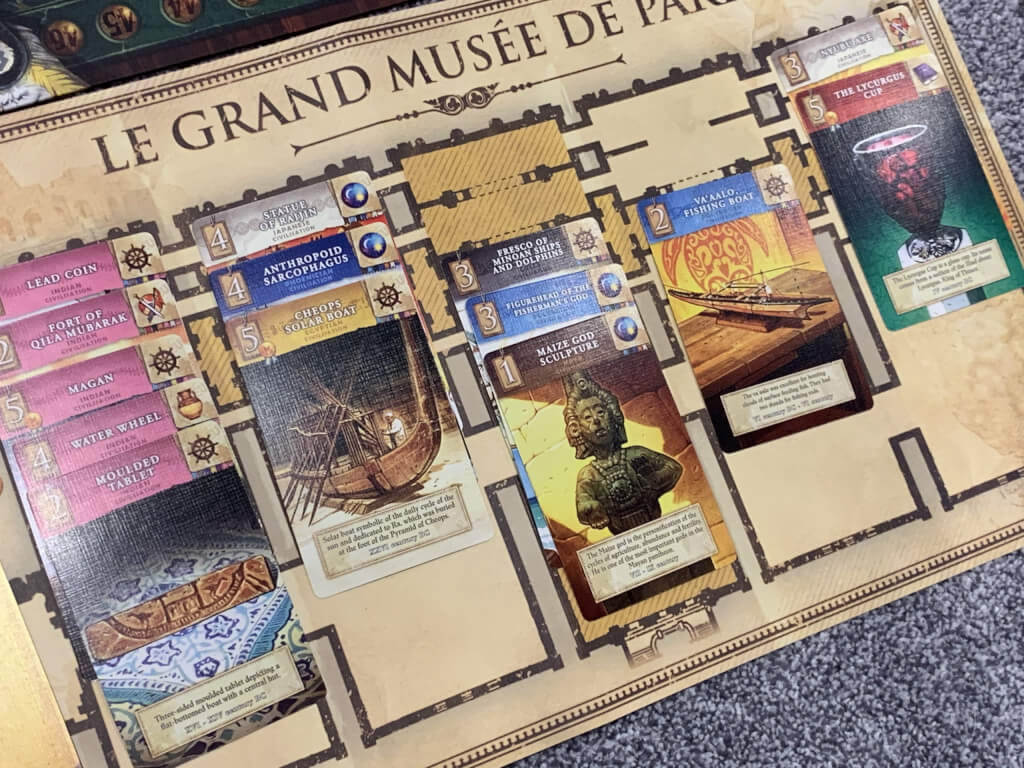 The players will each have a patron card that, alongside their museum board, offers the chance to achieve certain end game scoring bonuses based on the sets they have when the game is over. This patron card (chosen from three dealt out during setup) will usually influence the early choice about which card to draw — for example you may wish to focus on the Indian, or Maya civilisations, or you may have a more complex patron requirement that expects sets of themed artefacts — for example focused on navigation or warfare.