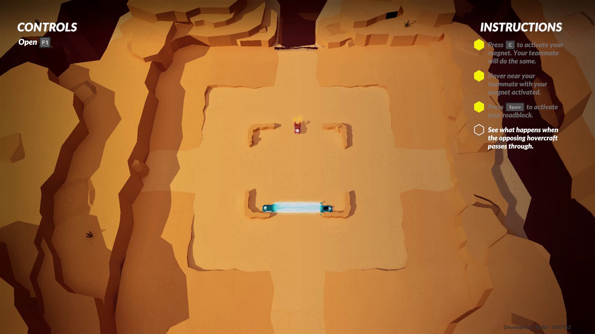 The game does, however, run best when the teams work together covering both disciplines of play. A single racer with the other two running distraction is easily the optimum state for tense play. The two harassers combing to build a force-field, or moving around a level’s 3/4 blockade tiles — squares which instantly stop anyone who hits them once they’ve been turned by a team. The blockades are interesting, as each player can pick them up while they’re inactive, and drop them with a single button press. Once dropped they’re turned to the colour of the team who had picked them up. In this state they will bring anyone of the other team to a halt should they touch it, while friendlies can still pass over them (there’s a similar principle for the force-field). The work around for this is either: (1) burn them with your jets, or (2) wait for a time out.