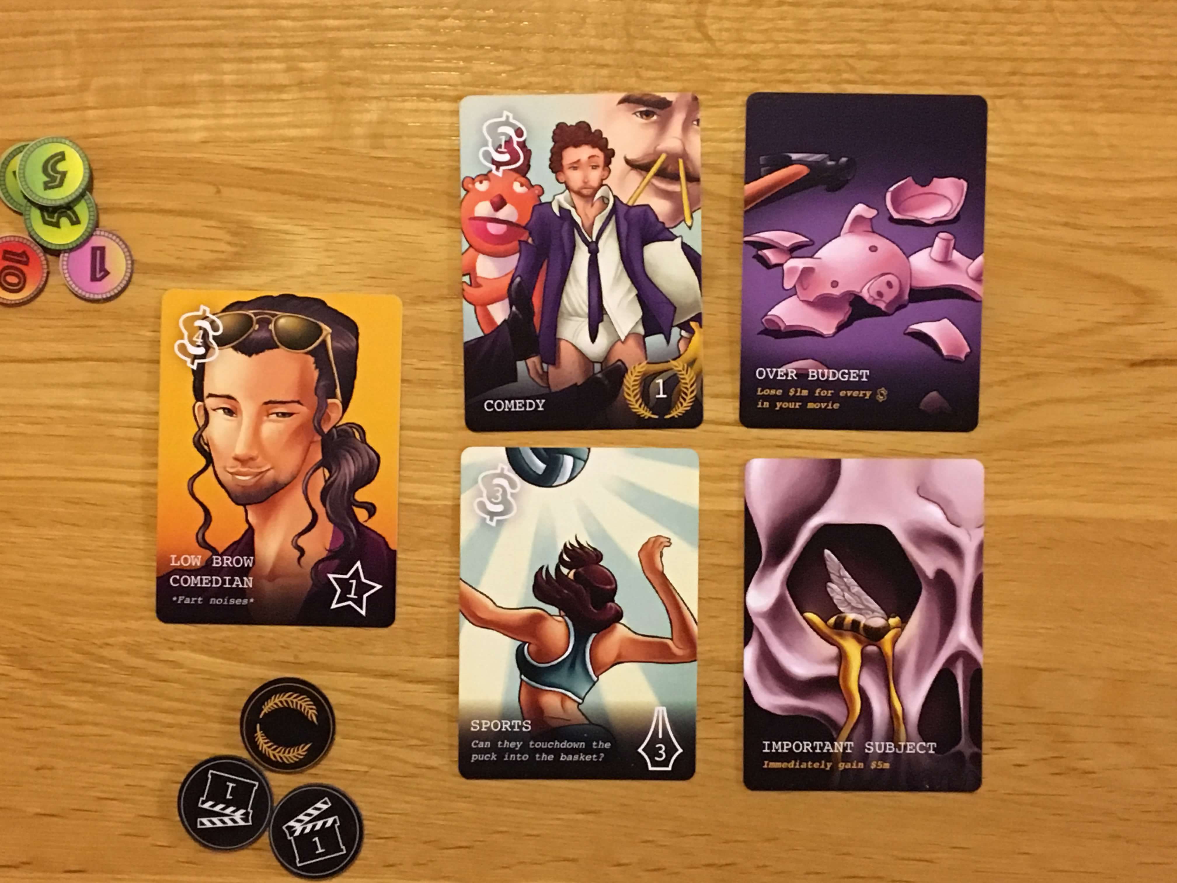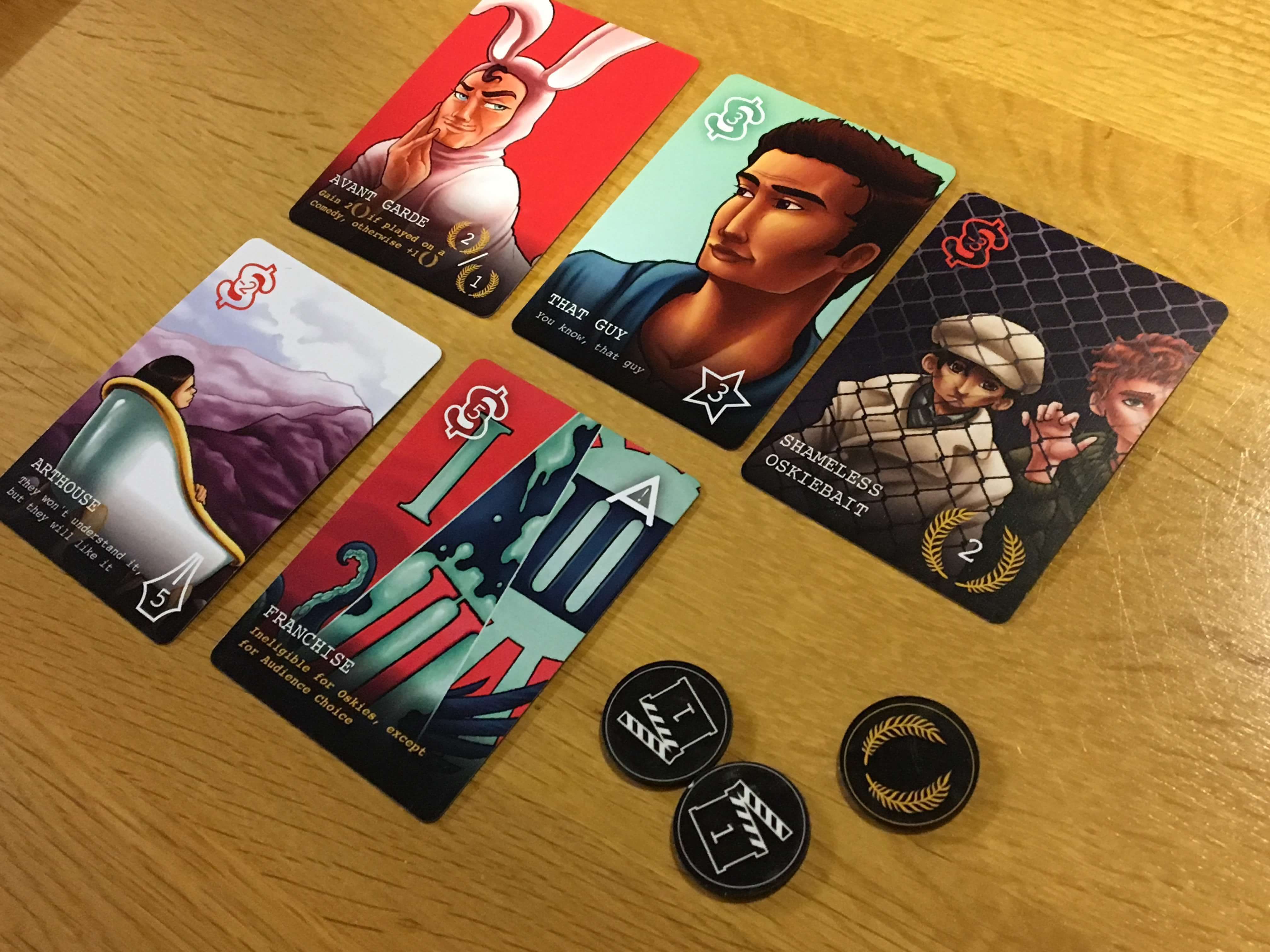 Aside from the cards (which do make up about eighty percent of the game) there are also Oskie chips, money and influence tokens. These were clearly not final in the version I played and as such, I have not included them greatly in the pictures. My copy featured what I would suggest is finished token artwork, albeit printed on stickers and then applied to a mixture of plastic and card tokens. I suspect these will be replaced with standard punchboard tokens for the final print run, but I have no reason to think that they’ll be anything other than perfect for the job.