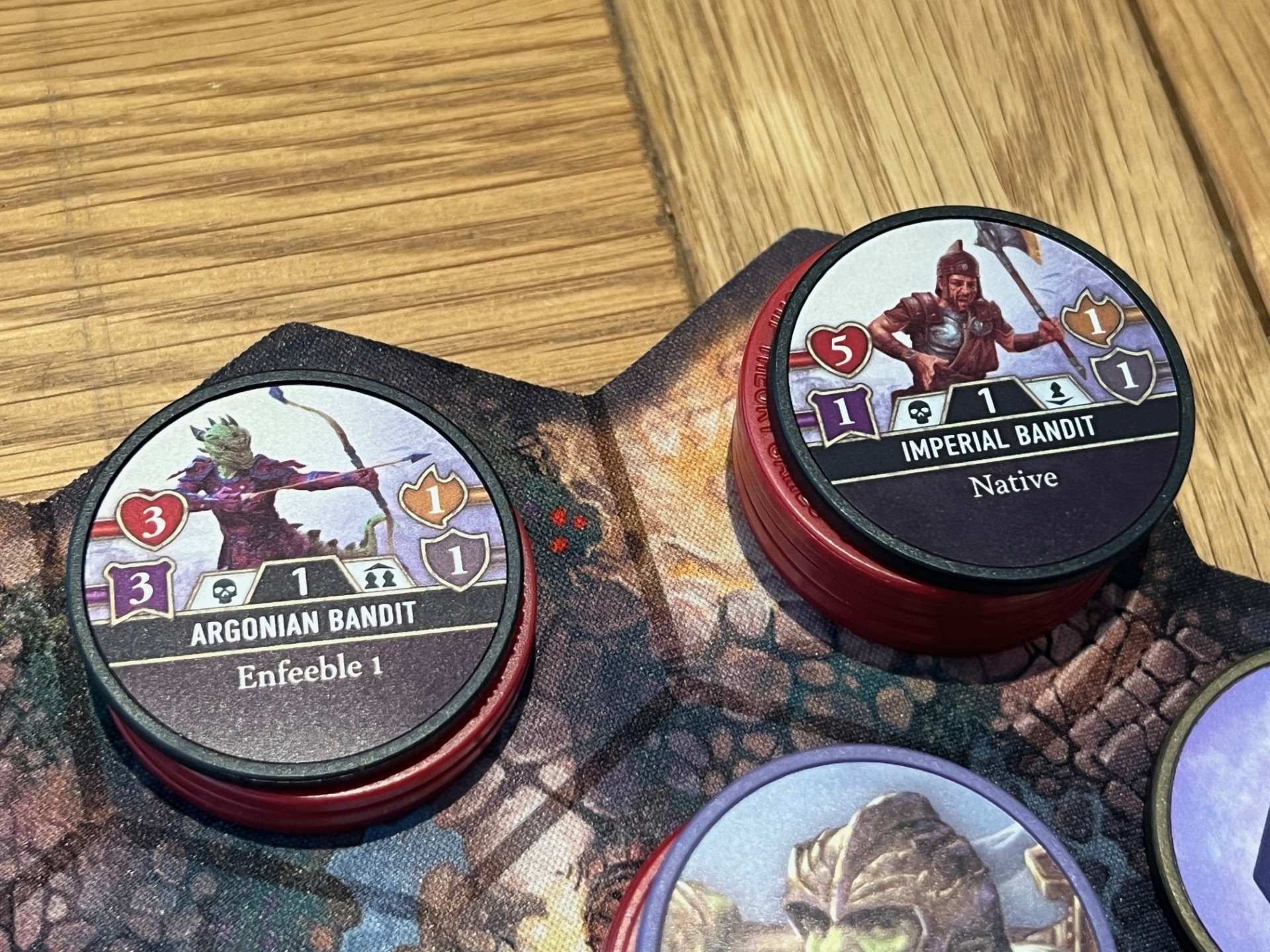 Whilst city encounters are essential and peaceful encounters add a lot of the flavour that makes The Elder Scrolls: Betrayal of the Second Era what it is, the real meat of the game comes in combat. With a specific battle mat setup and the enemy chips drawn, players must use their items and abilities to overcome whatever enemies the game throws at them. This is where I feel Chip Theory Games borrow from their other very popular game, Hoplomachus, to offer a simple “AI” that drives enemy behaviour and maintains a good level of challenge throughout.