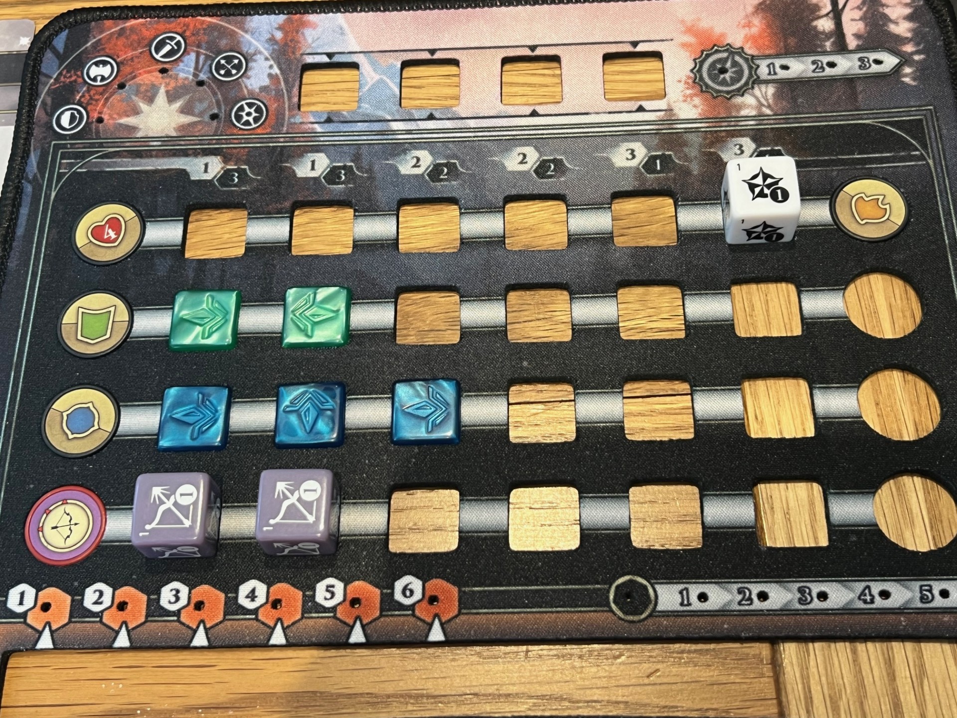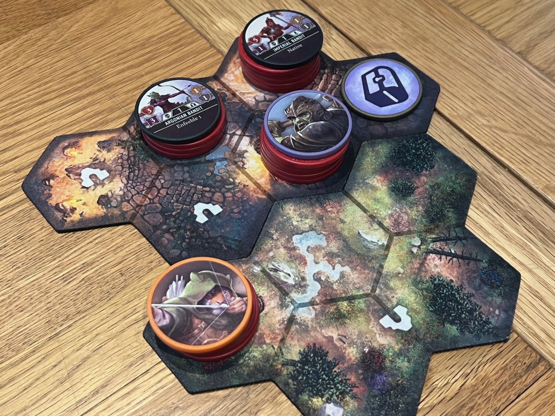 Each enemy has its own behaviour, much of which is driven by keywords. Enemy health, like player health, is tracked with plastic chips placed underneath the enemy token and must be whittled down. At the start of the game when you have one simple skill to use yourself, and you’re facing a small number of enemies with at most one keyword each, this is very simple to manage. As you gain experience and add new skills and face more powerful foes, things do get more complex and this is partly why I say the game can go long with multiple players. With just one or two, especially when you know the game, things run a lot more smoothly.