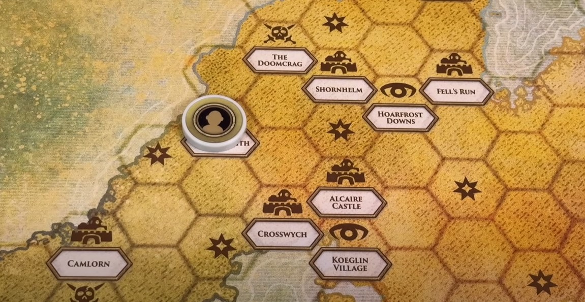 Whilst I am talking about the enemy chips, let’s talk briefly about fights and how you get to them, but before I do that, I need to touch on regional exploration. Each of the regions features a map that the party will explore over roughly twelve in-game days per session. The region maps feature city and encounter spaces, with the former always resulting in a city encounter (with its own rules) and the encounter spaces offering peaceful, combat and unstable variants that are determined by a card draw.