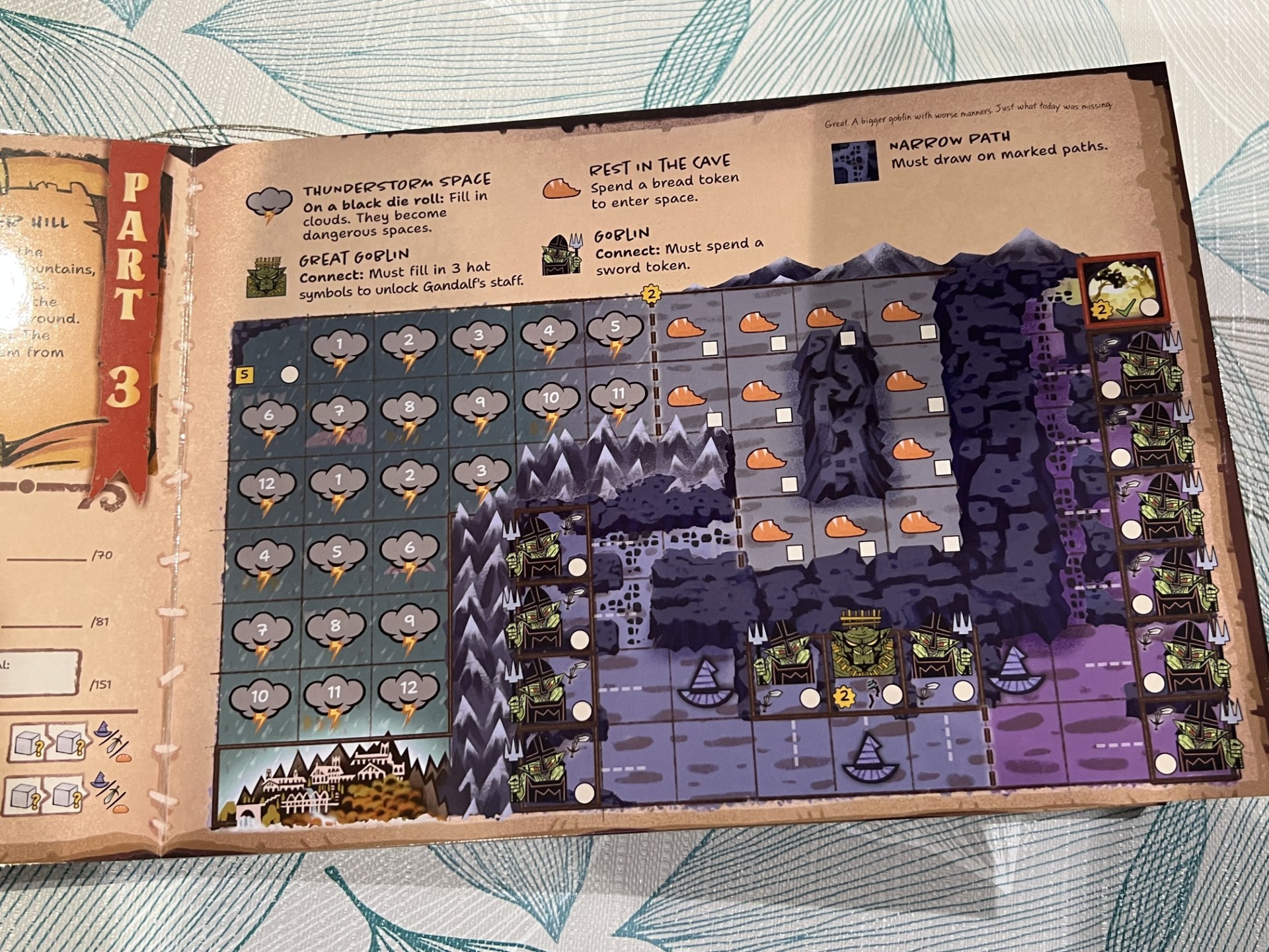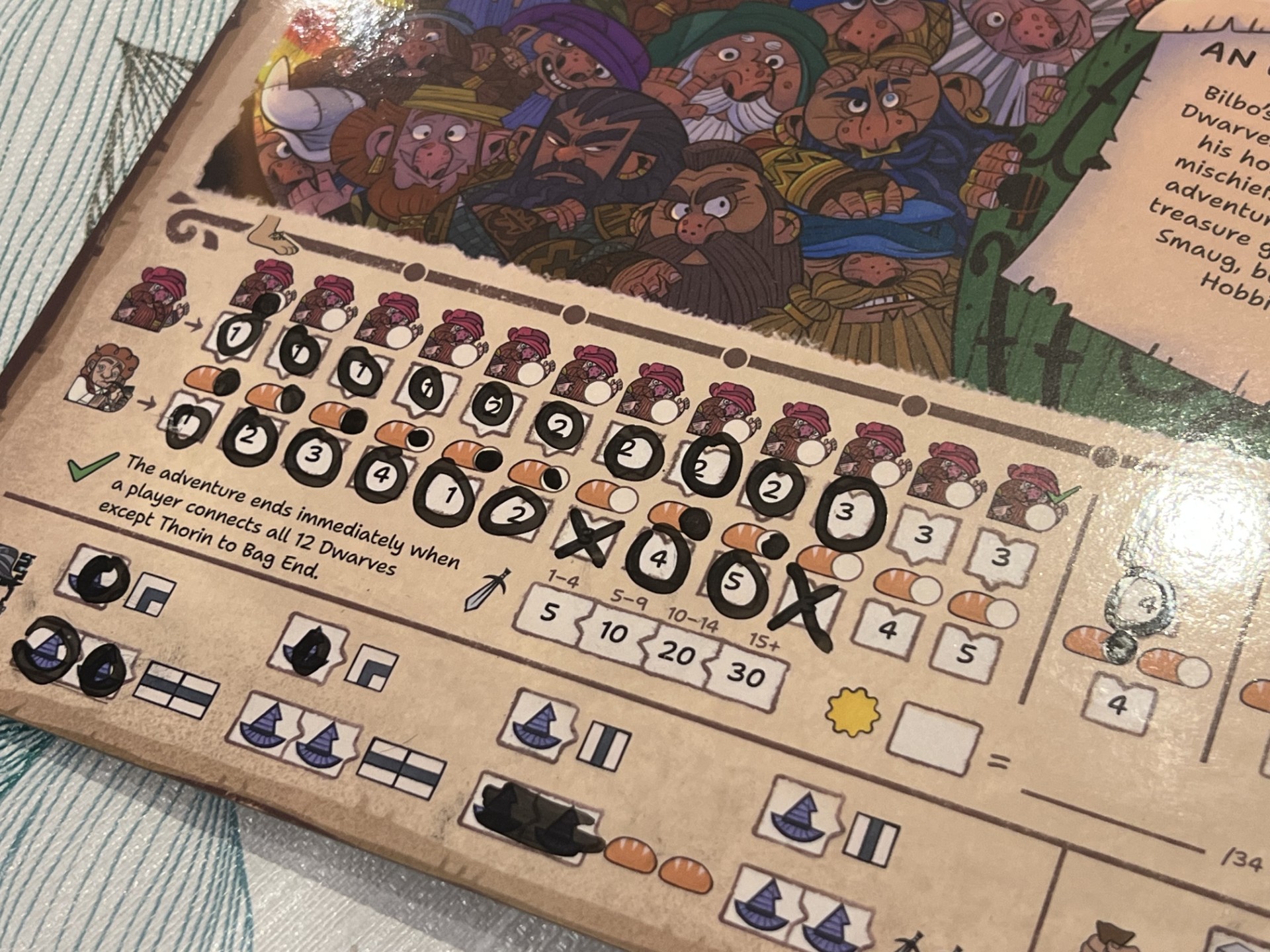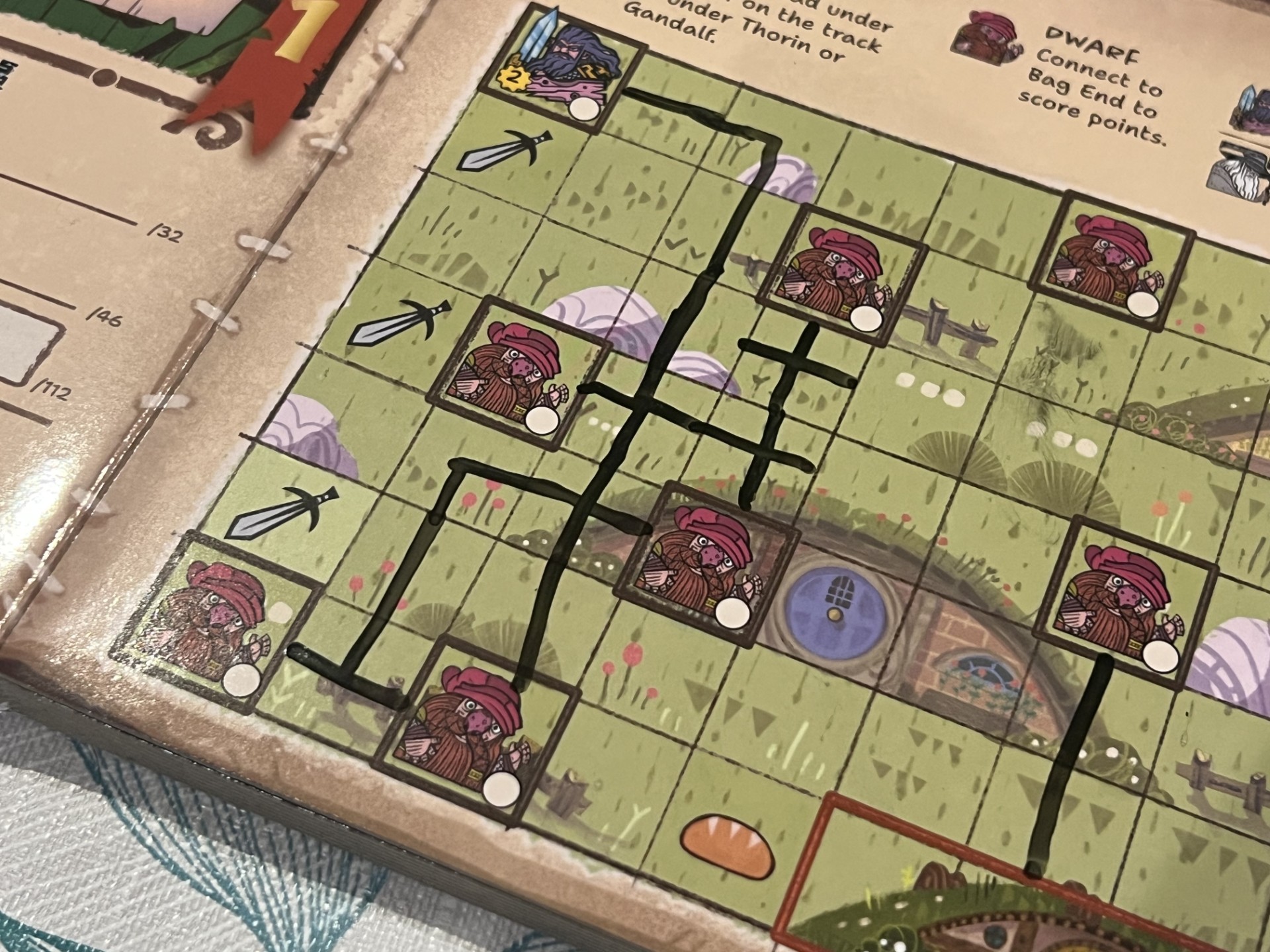 Each game of There and Back Again revolves around a single quest, with all players opening their booklets to the same page. These quests are self-contained puzzles, each with its own map, scoring conditions, and thematic flourishes. The first adventure, for example, tasks players with connecting the thirteen dwarves (plus Gandalf) to Bag End using a series of drawn lines. Feed the dwarves with bread, and you’ll earn bonus points. It’s simple stuff at the start, but it works really well.