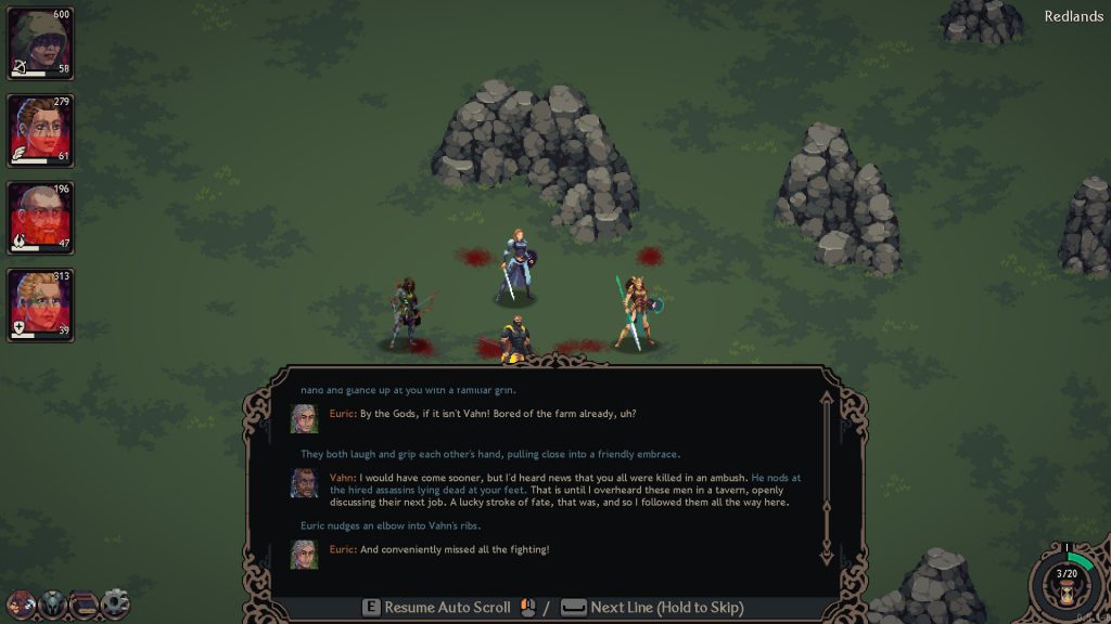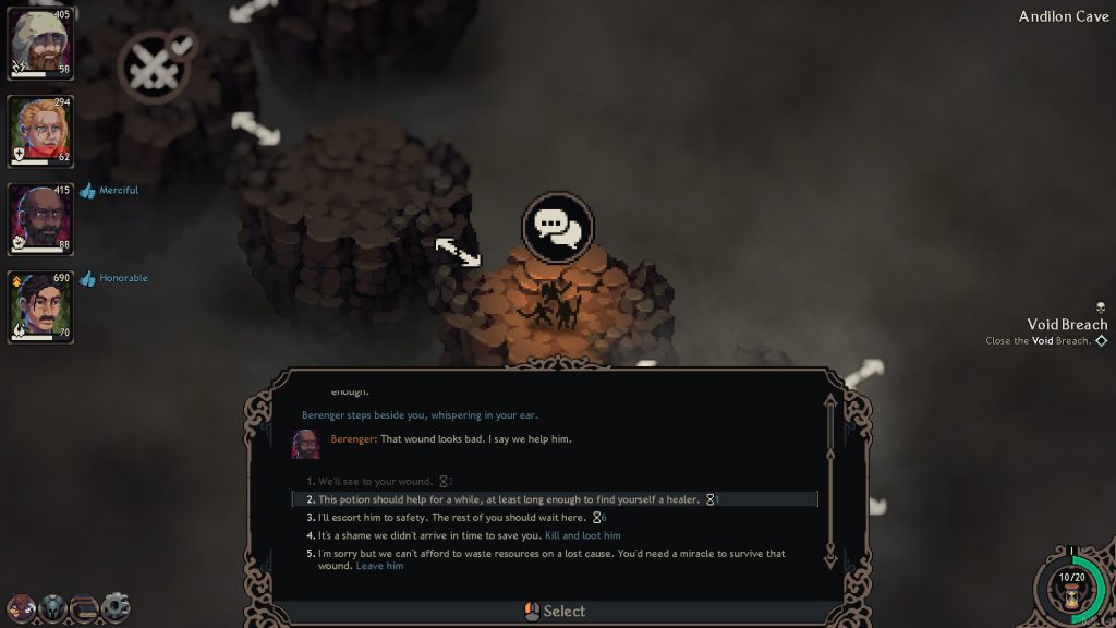Its tutorial, while a little linear, paints a slightly different world than the one you’ll be exploring. A cave dive culminating in a retirement party suddenly shifts into a massacre as your mercenary gang turn on itself for profit. Only you and a couple of company stalwarts remain and immediately form a new company to seek vengeance and rescue a kidnapped child. The thing is, there’s no opportunity for grand betrayals in-game, and writing that plays on those relationships will only happen around scripted events — so it can feel a little light on story at times after such a grand introduction. That said, the dialogue is very well written and Curious Panda Games have clearly made a deliberate effort to make your mercenaries get involved in conversations where they can, and to make them seem like deliberately written companions. As characters in older RPGs would, they act like they have their own concerns and fears, and converse with other characters in your party. Unlike many of those games, your characters can wind up permanently dead, and your mercenaries will comment on it — I’ve had one character permanently die after misjudging a mission, and everybody held a funeral. It’s six of one and half a dozen of another when it comes to the appeal of these clever design choices, they feel novel and new until things start repeating, at which point it’s almost worst than it not being there.