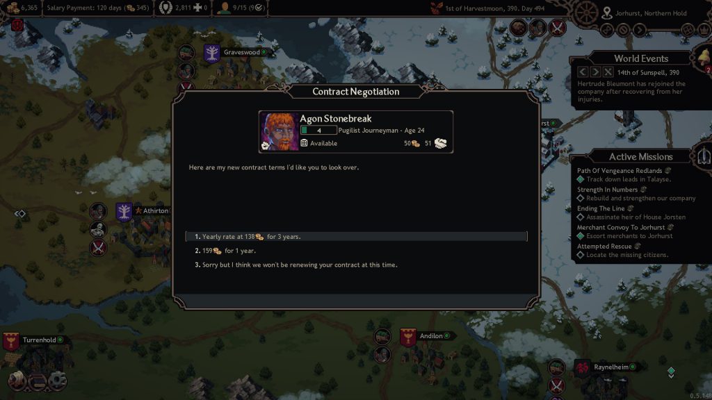 Time is incredibly important, not just for the development of The Iron Oath, but also for the characters in the world. In many ways, time is one of the main characters of Caelum. Its citizens are stuck in a perpetual dark age, made worse by the fact that a dragon turns up and smashes stuff up every decade, stirring up the demonic void beasts (as if the looters, raiders and robbers weren’t enough). Nobody’s moving out of a dark age with that much evil rattling around, keeping everybody poor and destitute. But time also has a role in how you interact with your mercenaries; you negotiate contracts with them for years at a time and, well, humans only have so many years, even if they are a particularly hardy adventurer. Your mercenaries will age, they’ll retire and if they don’t then, well, it’s because they’re dead. That said, I’ve not had anybody retire yet, and while a starting companion of mine is clearly ageing and getting close to it, it hasn’t fired just yet and… maybe that’s for the best, I’m quite invested in the idea of rescuing the kidnapped child I mentioned — although part of me does wonder what happens if I take too long to get there, will I find them as an old man, long after my protagonist should have keeled over under the weight of time?